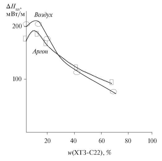 Рис. 2. Зависимость энтальпии плавления ΔHпл композитов на основе алкилированного хитозана и ПЭНД от массовой доли w Х-С22.