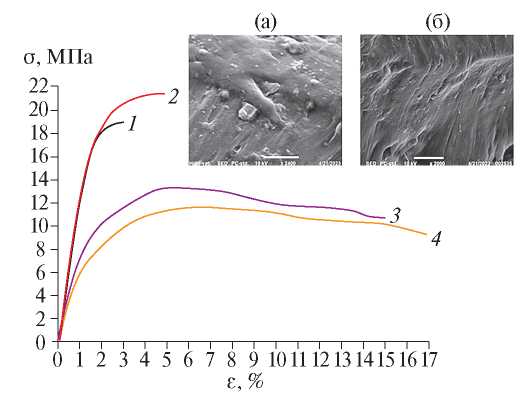 Рис. 6. Динамометрические кривые, полученные в процессе одноосной деформации композитных пленок ПЭНД/хитозан 80/20 (1), ПЭНД/Х-С22 80/20 (2), ПЭНД/Х-С22 80/20 + 5% вазелинового масла (3) и ПЭНД/Х-С22 80/20 + 10% вазелинового масла (4). На вставках приведены СЭМ микрофотографии сколов, полученных из пленок ПЭНД/Х-С22 без вазелинового масла (а) и с 10 мас. % вазелинового масла (б).