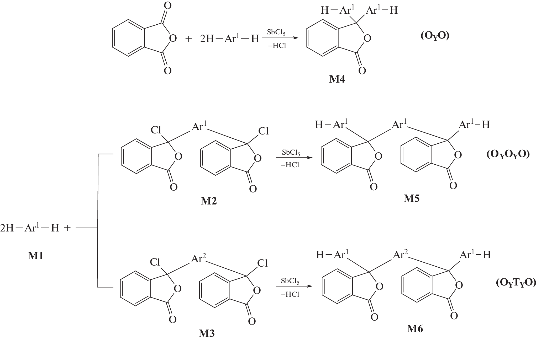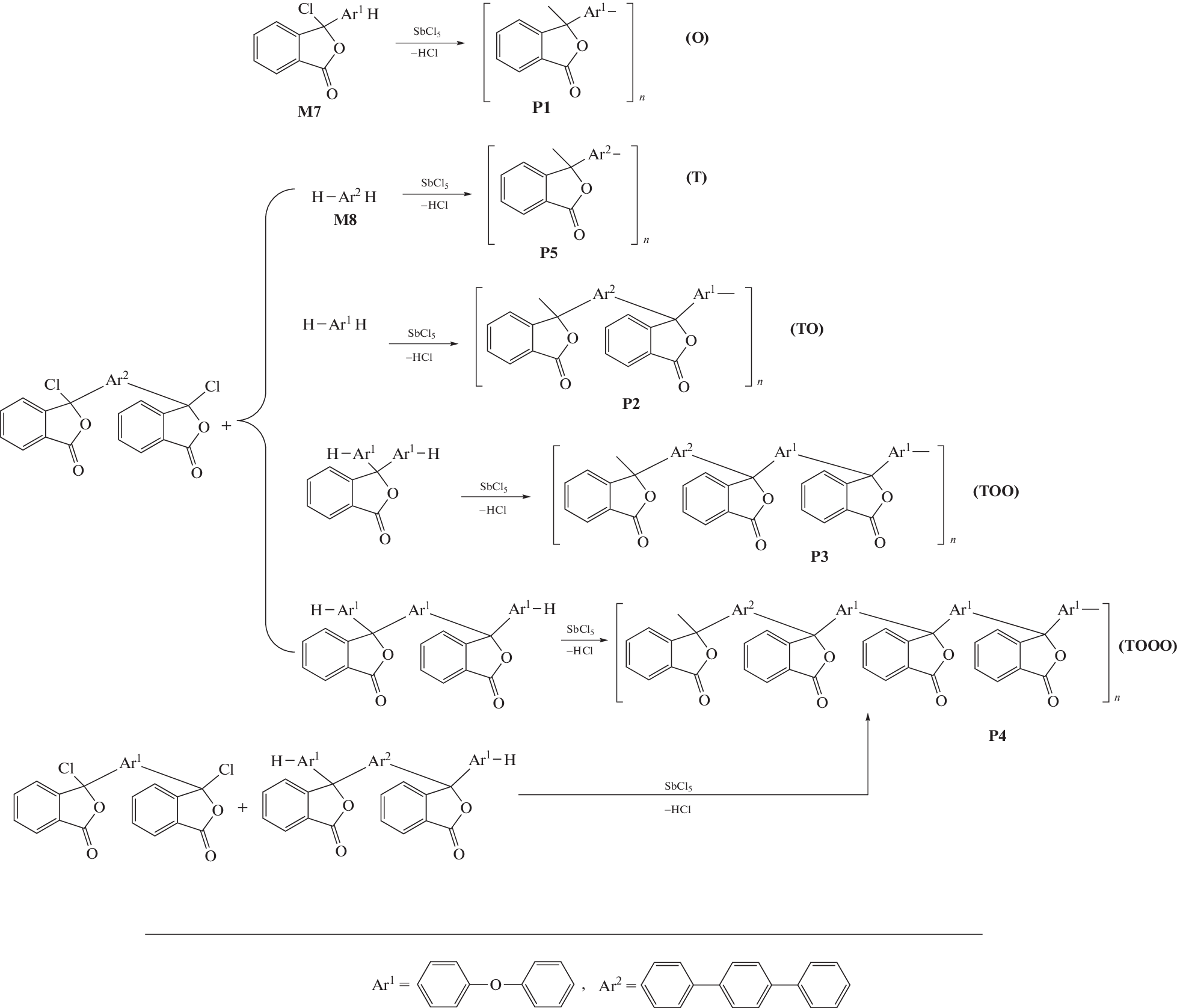 The macromonomers of the dyad (OYO) and triad (OYOYO, OYTYO) structure (with О being diphenylene oxide, T being terphenylene, and Y being the phthalide cycle) as well as a series of (co)poly-arylenephthalides with general formula [(OY)p(TY)q]n differing in the ratio between the diphenyleneoxyphthalide p and terphenylenephthalide q groups (p : q = 0 : 1, 1 : 1, 2 : 1, 3 : 1, 1 : 0) have been synthesized. Photooptical and emission properties of the solutions and thin films of the synthesized (co)polymers and their aggregates formed upon the addition of a bad solvent have been investigated.