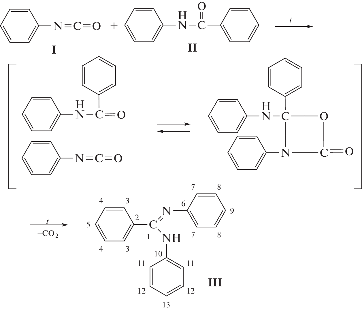Aromatic polyamidines based on 4,4′-diphenylmethane diisocyanate and bisamides have been synthesized and studied. The one-step reaction of bisamides with diazocyanate according to the [2+2]-cycloaddition mechanism includes a concerted process of the formation of two new σ-bonds in the transition state. The formation of polyamidine occurs as a result of decarboxylation, which completes this reaction. Due to the availability of starting compounds, ease of synthesis, good solubility, and high heat resistance and thermal stability of the resulting polymers, there are wide opportunities for producing new materials by conventional industrial processes. Polyamidines have a sufficiently large set of important technological properties, which suggest their greater potential in relation to applied problems. The resulting film materials and glass-reinforced plastics based on polyamidines show high mechanical properties that are not inferior to those of materials made from commercial polyamides and polybenzimidazoles.