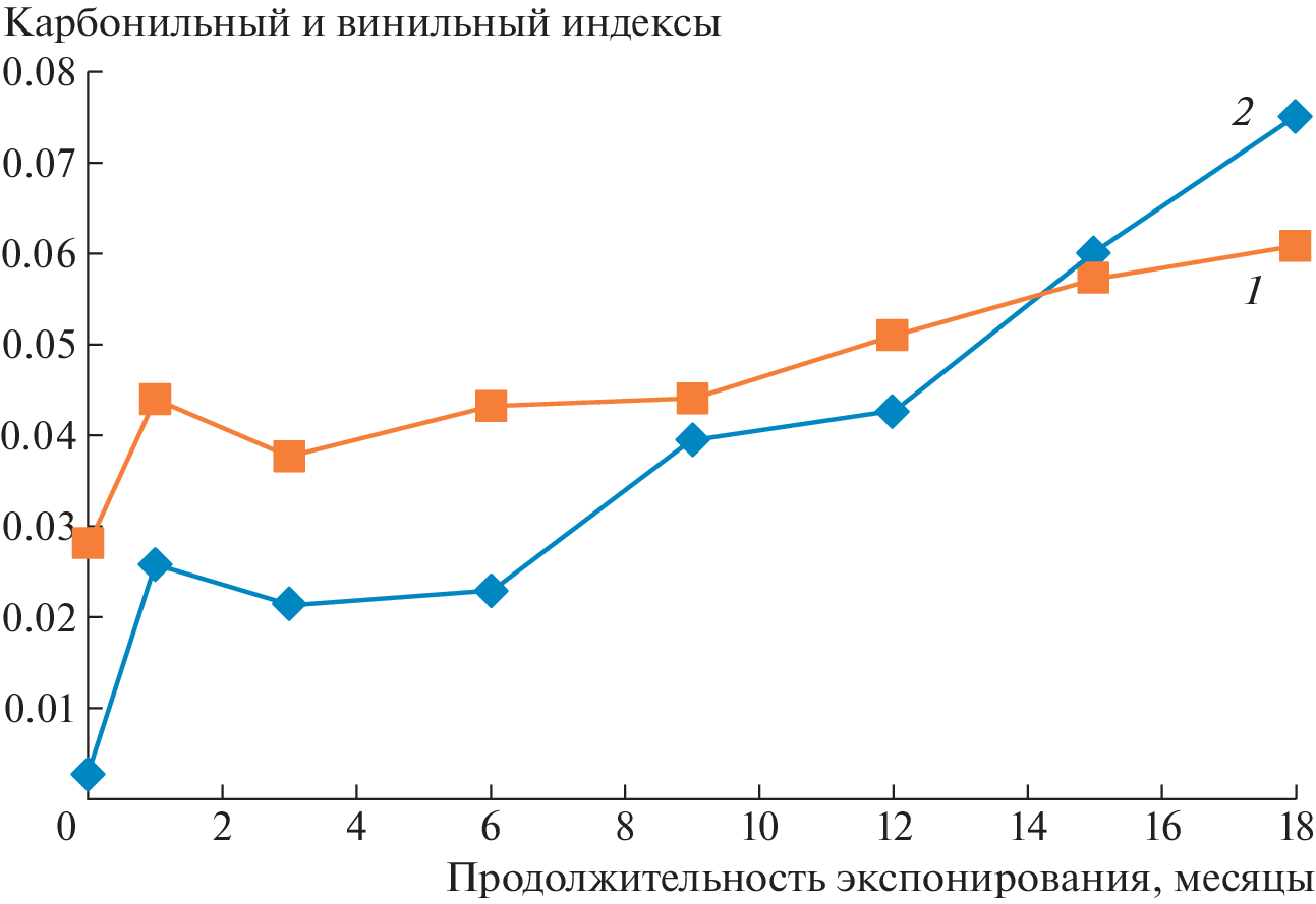 Условия эксплуатации изделий из полимерных материалов оказывают существенное влияние на срок их службы. В данной статье представлены результаты исследования продолжительности воздействия естественных климатических факторов Республики Саха (Якутия) (зона очень холодного климата) на структуру и свойства полиэтилена марки 273-83. С помощью метода ИК-спектроскопии установлено, что при продолжительном натурном экспонировании в материале протекают радикальные окислительные реакции, вызывающие снижение молекулярной массы полимера. Исследование показателя текучести расплава показало, что в полимере кроме реакций, сопровождающихся разрывом макромолекулярных цепей, протекают также процессы сшивания. Оба процесса приводят к снижению молекулярной массы полимера и расширению молекулярно-массового распределения. Изменение степени кристалличности и размеров ламелярных образований имеет немонотонный характер и определяется метеоусловиями в период экспонирования. Изменения интенсивности солнечного излучения, а также среднесуточных и сезонных температур окружающего воздуха в совокупности с химическими изменениями, протекающими в полимере при натурном экспонировании, приводят к появлению областей упорядоченных структур в аморфной фазе, в результате чего толщина аморфного пространства, обусловливающего пластичность материала, снижается. При этом напряжения в макромолекулярных цепях полимера, находящихся в аморфной фазе повышаются настолько, что полимер демонстрирует поведение хрупкого материала.