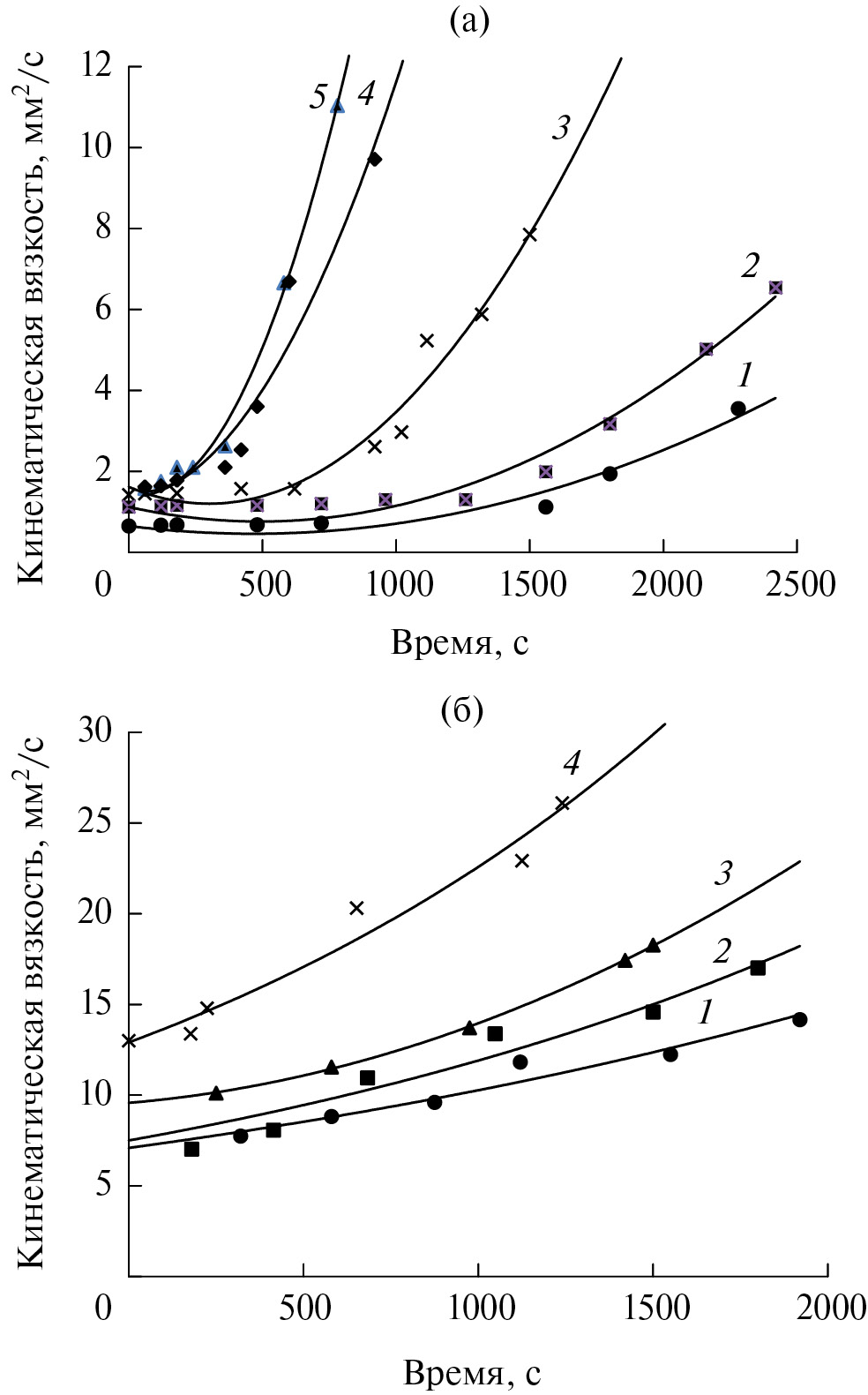 Рис. 1. Зависимости кинематической вязкости реакционной смеси от времени синтеза при различных значениях концентрации хитозана “Bombyx Mori” (а) и хитозана из панциря краба (б): а – 0 (1), 1.36 × 10–3 (2), 2.68 × 10–3 (3), 3.96 × 10–3 (4) и 5.61 × 10–3 осново-моль/л (5). [Акриловая кислота] = 1.21 моль/л, [персульфат калия] = 2.5 × × 10–3 моль/л, Т = 50°С; б – 1.77 × 10–3 (1), 4.43 × × 10–3 (2), 8.87 × 10–3 (3) и 1.33 × 10–2 осново-моль/л (4). [Акриловая кислота] = 1.25 моль/л, [персульфат калия] = 6.5 × 10–3 моль/л, T = 60°С.