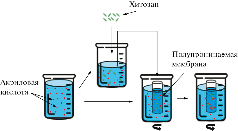 Свойства хитозана могут быть в существенной степени улучшены посредством его химической модификации, а именно с помощью привитой сополимеризации с акриловыми мономерами, которая может быть осуществлена с применением подходов псевдоживой полимеризации, например ATRP [7]. Привитые сополимеры хитозана и акриловых полимеров также могут быть получены в условиях окислительно-восстановительного инициирования в присутствии нитрата аммония–церия и азотной кислоты при УФ-облучении [8], путем радиационной прививки акриламида к цепям хитозана в водных растворах уксусной кислоты [9]. Распространенными инициаторами для синтеза гидрогелей привитых сополимеров хитозана, акриловой кислоты и акрилонитрила выступают персульфаты, такие как персульфат аммония [10].