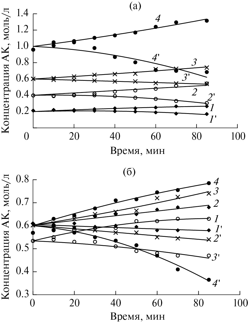 Рис. 3. Зависимости изменения концентрации акриловой кислоты от времени внутри мембраны, с хитозаном (1‒4) и вне мембраны, без хитозана (1′–4′): а – [хитозан] = 4.66 × 10–3 осново-моль/л, [акриловая кислота] = 0.2 (1), 0.4 (2), 0.6 (3) и 1.0 моль/л (4); б – [хитозан] = 1.55 × 10–3 (1), 3.10 × 10–3 (2), 4.66 × 10–3 (3) и 6.21 × 10–3 осново-моль/л (4). Исходная концентрация акриловой кислоты 0.6 (1, 2, 4) и 0.54 моль/л (3).