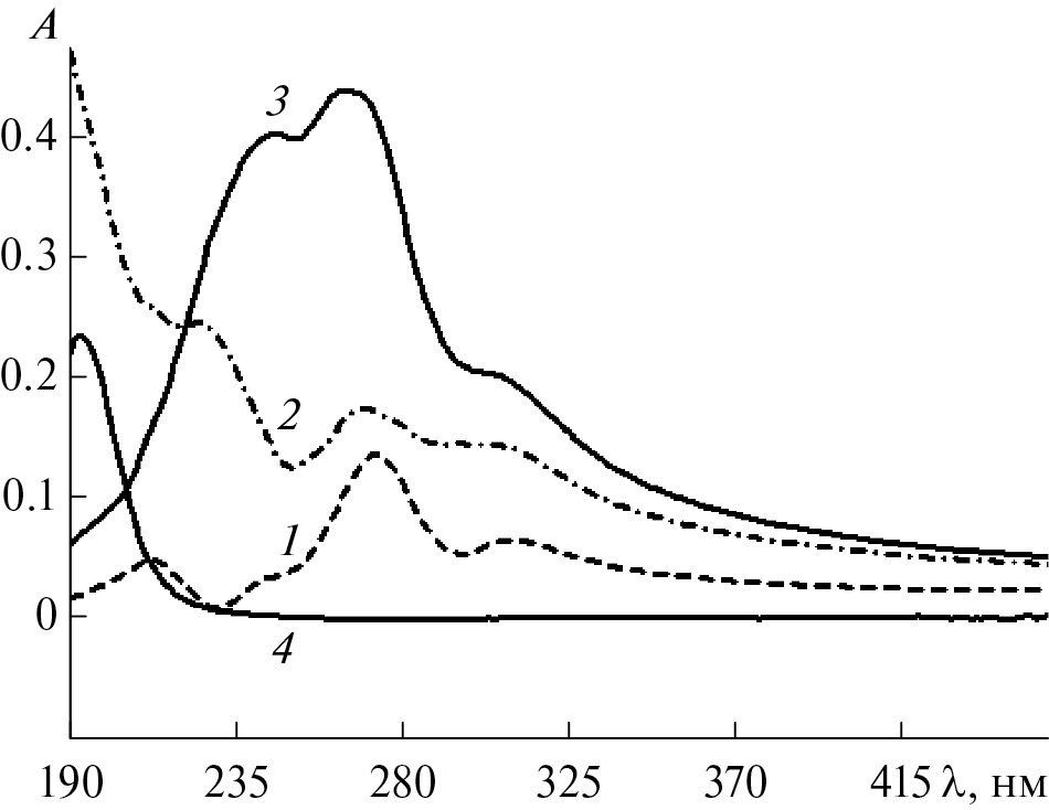Рис. 4. УФ-спектры раствора хитозана в акриловой кислоте. [Хитозан] = 1.97 × 10–2 (1), 1.2 × 10–2 (2), 6.56 × 10–3 осново-моль/л (3); [акриловая кислота] = 1.21 моль/л (4).