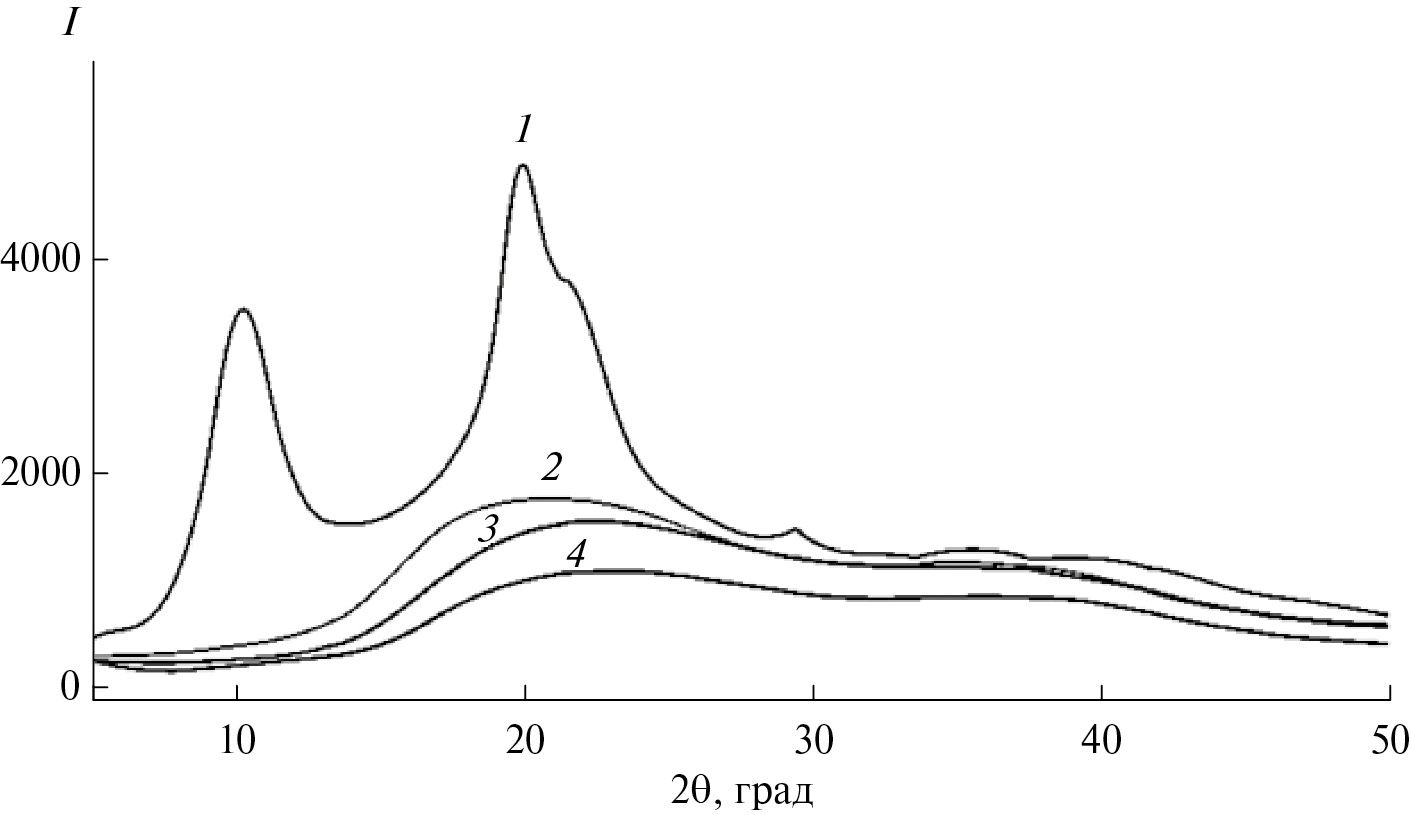 Рис. 7. Рентгеновские дифрактограммы образцов хитозана (1) и привитых сополимеров, синтезированных при мольных соотношениях акриловая кислота : хитозан = 1.25 : (2.48 × 10–2) (2), 1.25 : (8.87 × 10–3) (3), 1.25 : (4.43 × 10–3) (4).