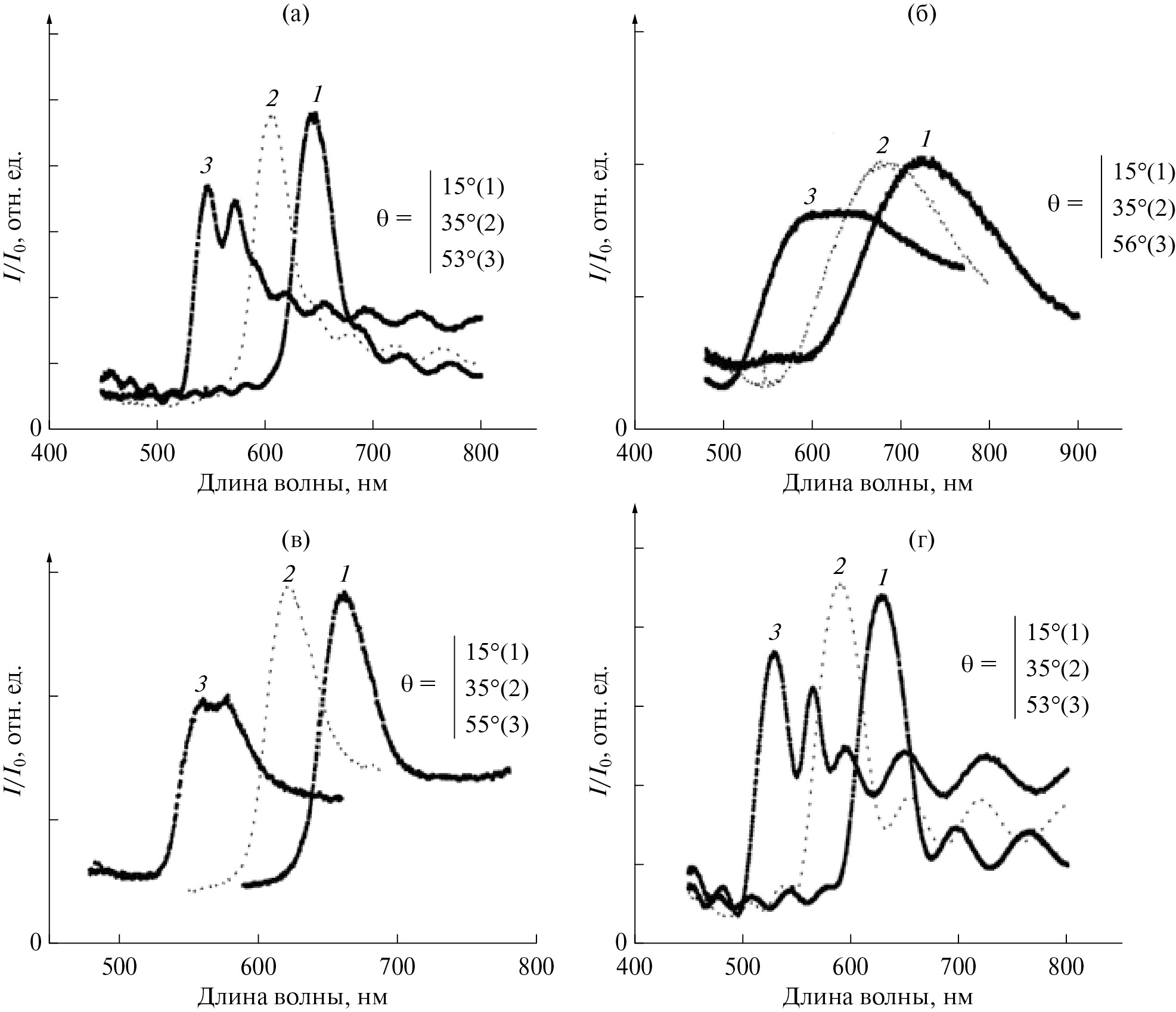 Рис. 4. Спектры брэгговского отражения света от ФК-пленки на основе частиц ФН3 (а), ФН4 (б), ФН5 (в) и ФН6 (г). θ = 15° (1), 35° (2), 53° (а, г), 56° (б) и 55° (в) (3).