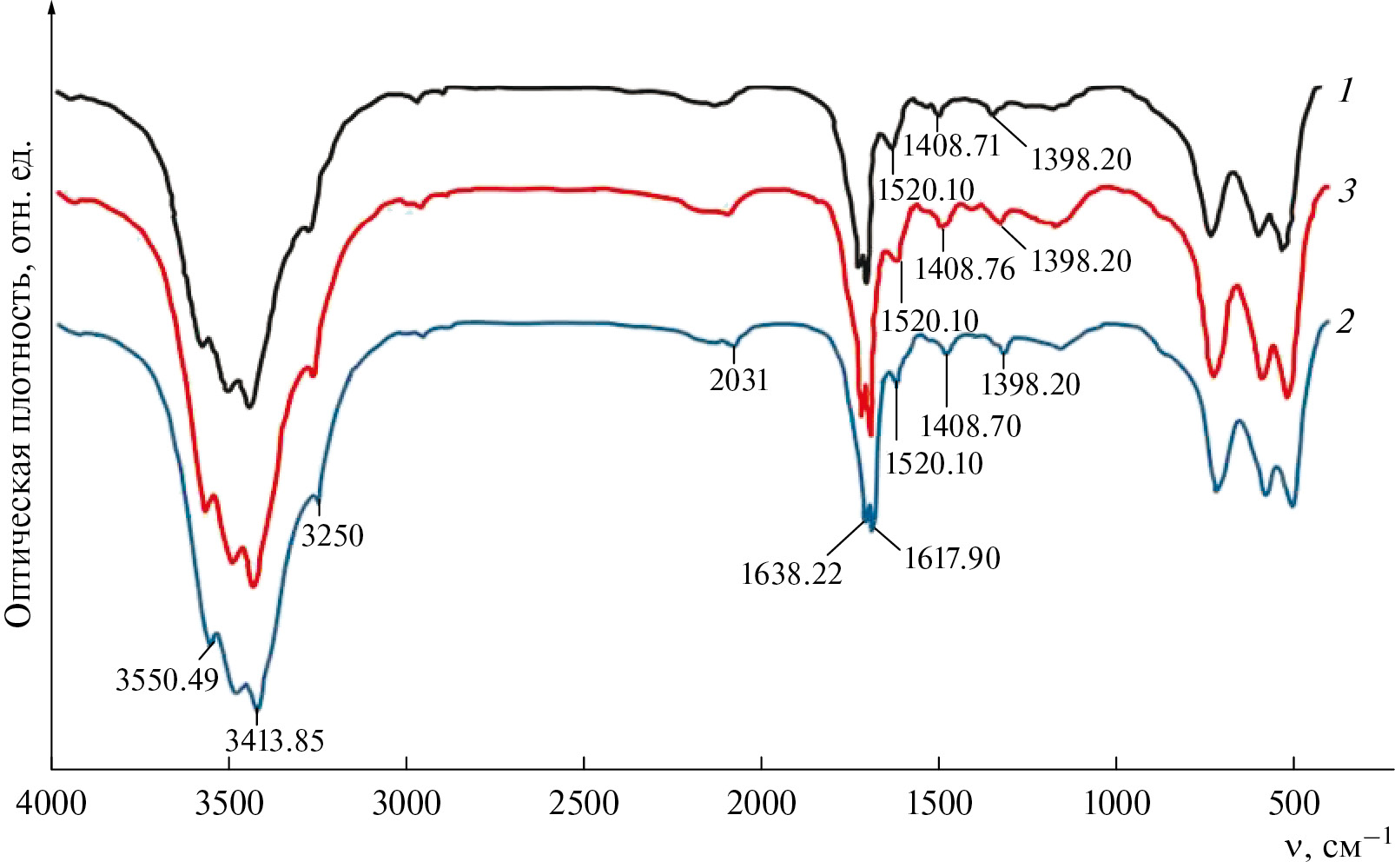 Рис. 1. ИК-фурье-спектры серицина различной молекулярной массы, полученные в различных условиях. Серицин со средней молекулярной массой М × 103 = 110 (1), 72 (2) и 5–6 (3).
