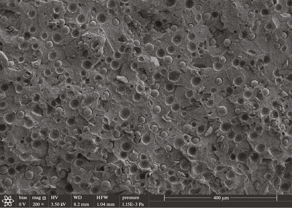 Синтезированные композиты Al2O3/сверхвысокомолекулярный ПЭ/ПЭ представляют собой реакторные порошки с двуслойным полимерным покрытием на частицах наполнителя, в котором слой сверхвысокомолекулярного ПЭ находится непосредственно на поверхности наполнителя, а второй слой из ПЭ более низкой молекулярной массы является внешним. В прессованных образцах полученных композитов достигается равномерное распределение частиц наполнителя в полимерной матрице, как показывает СЭМ- изображение поверхности хрупкого скола прессованного образца (рис. 1).