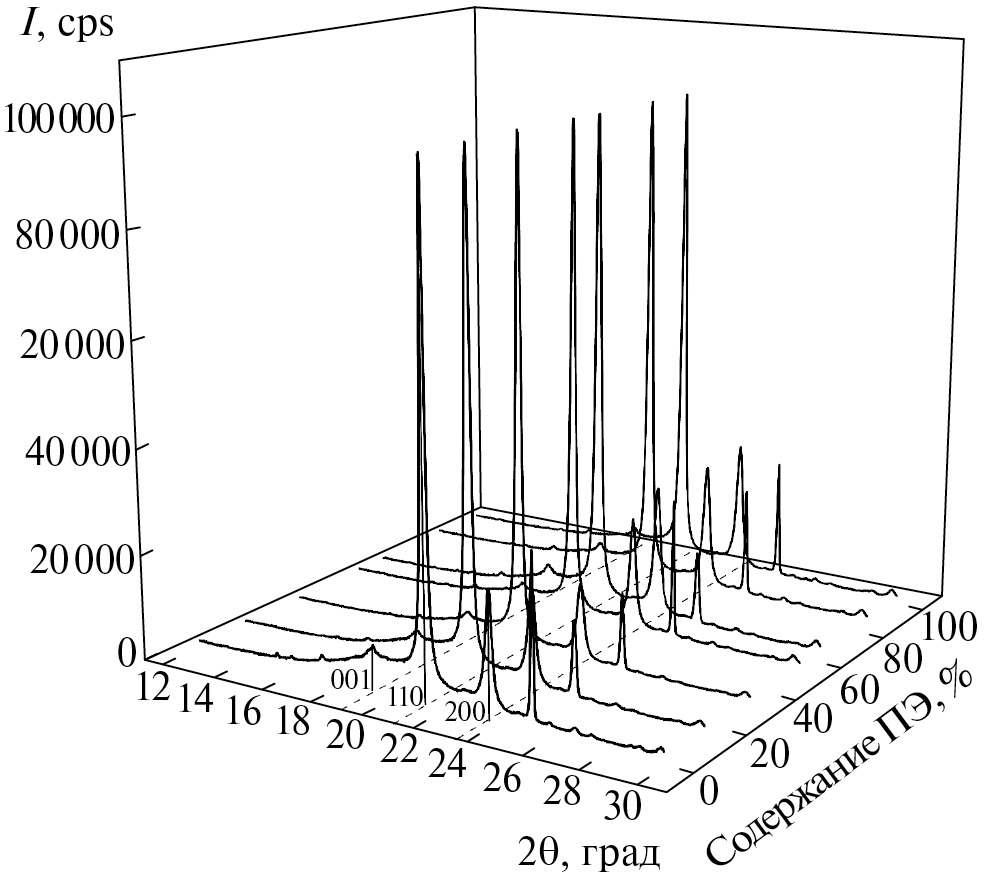 При увеличении доли ПЭ в полимерной матрице форма дифракционной кривой не изменяется, тогда как положение рефлексов смещается в сторону малых углов, что более заметно для моноклинной фазы, и наблюдается уменьшение полуширины орторомбических пиков 110 и 200 и пика моноклинной фазы 001.