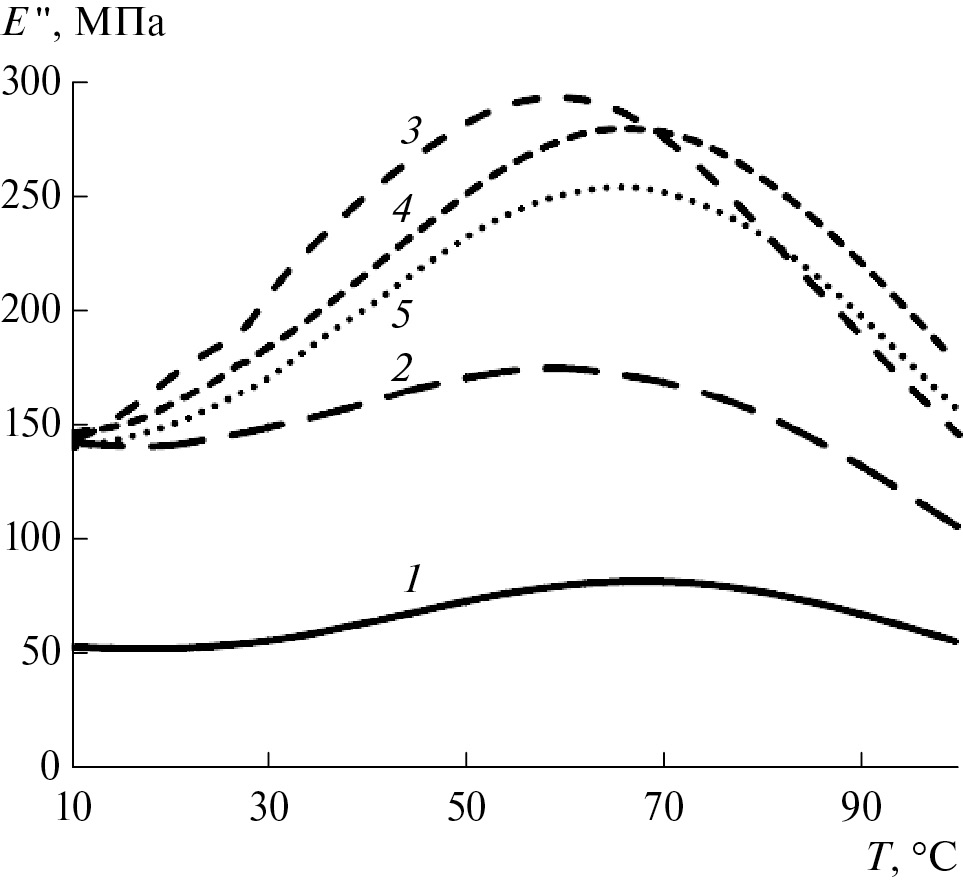 Рис. 3. Температурные зависимости модуля потерь сверхвысокомолекулярного ПЭ с М = 2.0 × 106 г/моль (1), композитов Al2O3/сверхвысокомолекулярный ПЭ с М = 2.0 × 106 г/моль (2) и Al2O3/сверхвысокомолекулярный ПЭ/ПЭ (3–5) с молекулярной массой ПЭ 3.7 × 105 (3), 2.5 × 105 (4) и 3.0 × 104 г/моль (5). Соотношение сверхвысокомолекулярный ПЭ : ПЭ ~ 80 : 20 мас. %, φ ~ 0.3.