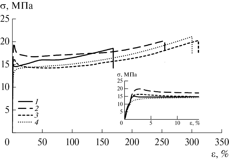 Как показывают эти данные, все исследованные композиты растягивались с небольшим упрочнением. На диаграмме растяжения композита со сверхвысокомолекулярным ПЭ (кривая 1) имеется неявно выраженный пик текучести, у двуслойного композита с молекулярной массой ПЭ 3.7 × 105 (кривая 2) присутствует выраженный предел текучести, при снижении молекулярной массы ПЭ до 2.5 × 105 (кривая 3) значение предела текучести уменьшилось. Композит с двуслойным полимерным покрытием, в котором молекулярная масса ПЭ равна 3.0 × 104 (кривая 4) растягивался с образованием шейки, хотя пик текучести на деформационной кривой неявный.