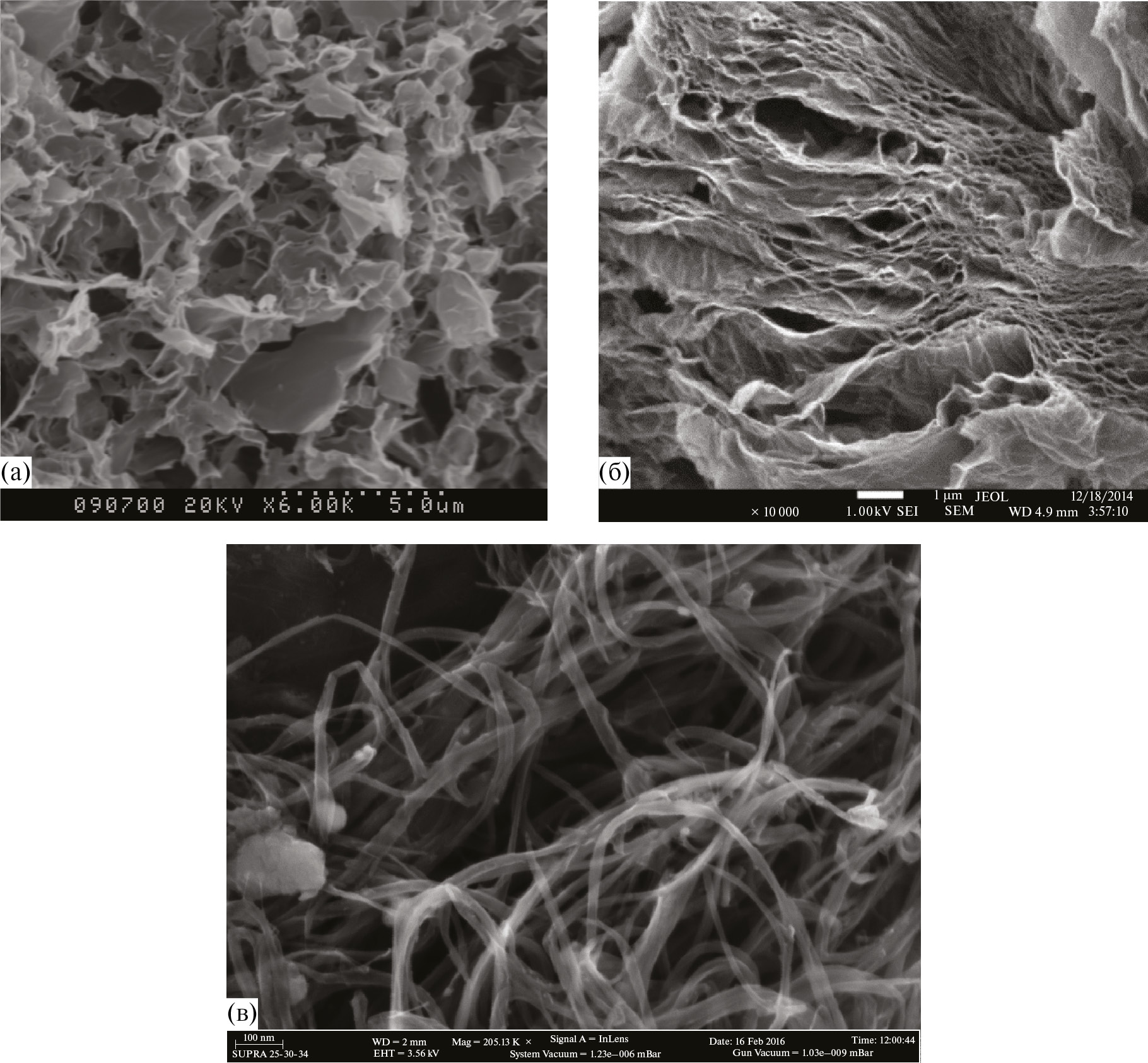Рис. 1. Электронные микрофотографии нанонаполнителей в исходном состоянии: а – химически восстановленный оксид графита, б – термически восстановленный оксид графита, в – одностенные углеродные нанотрубки (d = 1.4 нм, l > 5 мкм, Tuball™, OCSiAl). Удельная поверхность 230 (а), 620 (б) и 395–545 м2/г (в). Цветные рисунки можно посмотреть в электронной версии.