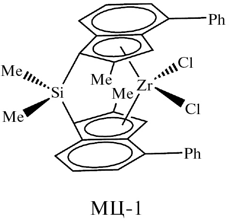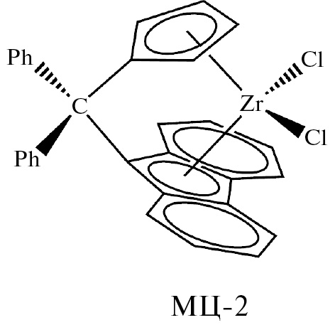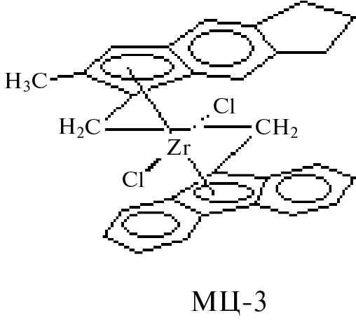 Ниже представлены структуры металлоценовых катализаторов: рац-Me2Si(2-Me-4-PhInd)2ZrCl2 (МЦ-1), Ph2C(Cp)(Flu)ZrCl2 (МЦ-2) и (C2H4)Flu(5,6cyclopenta-2-МеInd)ZrCl2 (МЦ-3).
