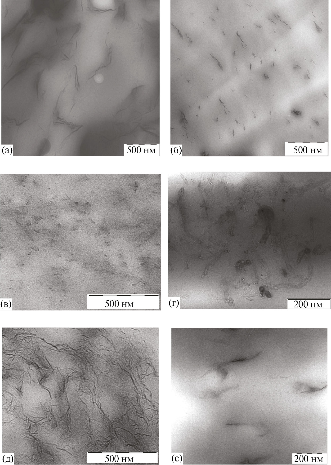 Рис. 3. Фотографии композитов, полученные методом просвечивающей электронной микроскопии. Композиты, синтезированы на металлоценовой (а–д) и титановой (е) каталитических системах. Наполнитель ГНП (а), ГНП, обработанные ультразвуком в течение 20 мин (б), ОУНТ (в), МУНТ (г), ТРОГ (д, е). Содержание наполнителя 2.3 (а), 1.8 (б), 1.2 (в), 0.9 (г), 3.3 (д), 0.2 мас. % (е).