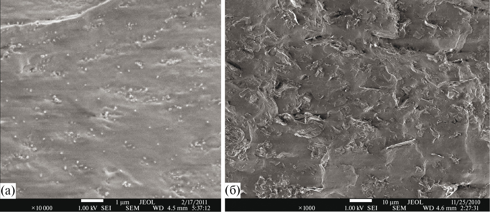 Рис. 4. Сканирующие электронные микрофотографии сколов пленок изотактический ПП/фуллерен (а) и изотактический ПП/ГНП (б) в жидком азоте. Композиты синтезированы на металлоценовой каталитической системе. Содержание наполнителя 0.8 (а) и 1.8 мас. % (б).
