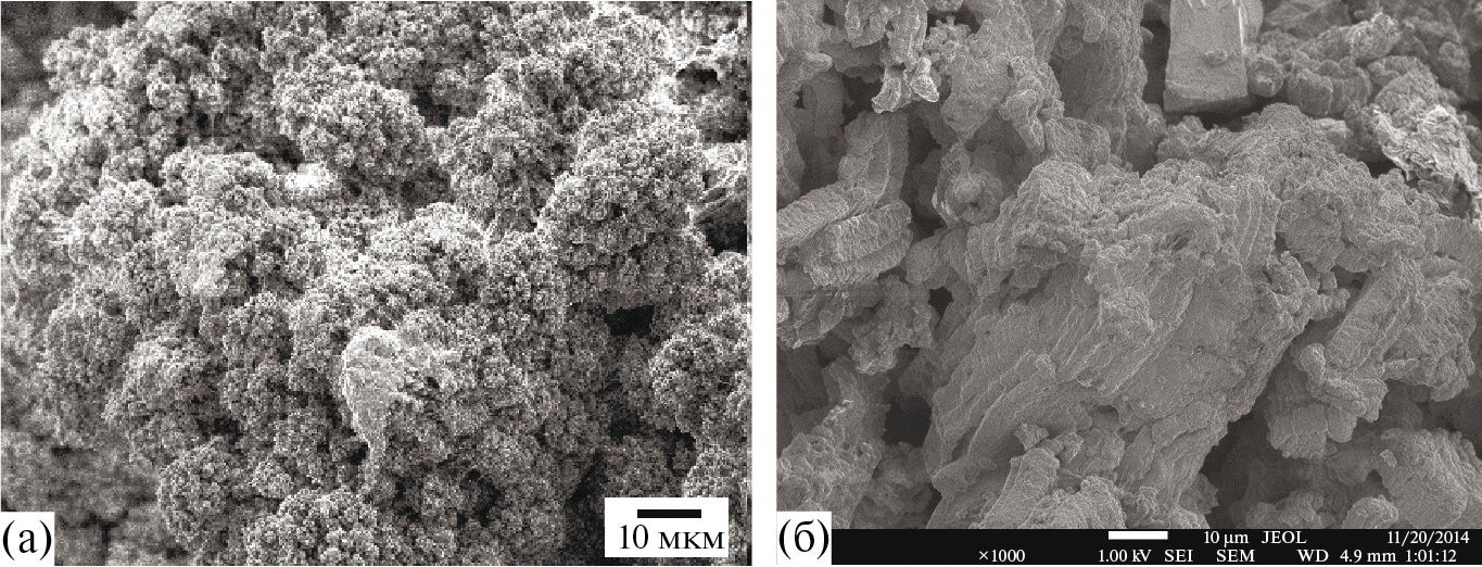 Рис. 5. Сканирующие электронные микрофотографии насцентных образцов нанокомпозитов изотактический ПП/ОУНТ (а) и изотактический ПП/ТРОГ (б), синтезированных на металлоценовой (а) и титановой (б) каталитических системах. Содержание наполнителя 1.2 (а) и 2.5 мас. % (б).
