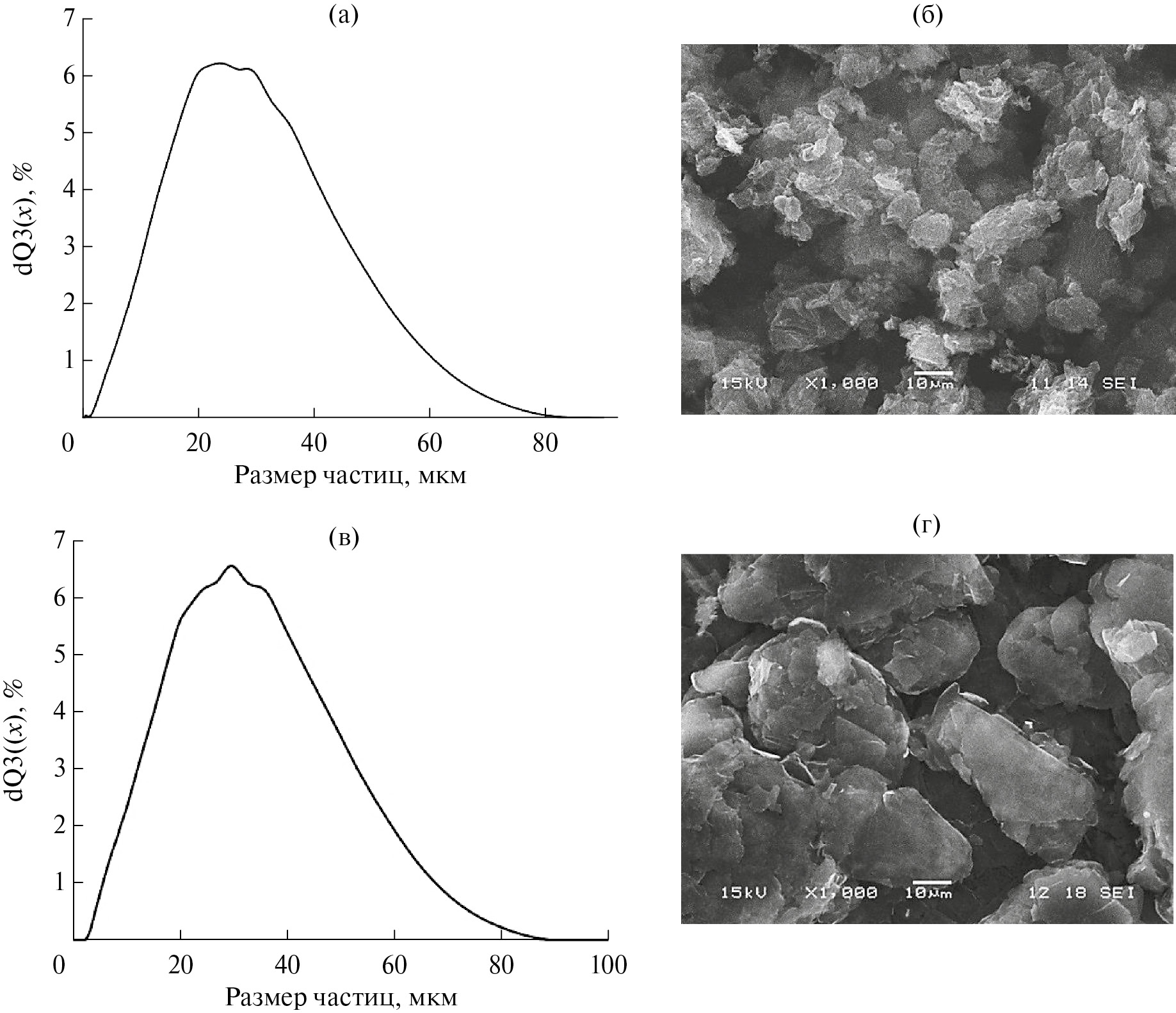 В табл. 1 представлены данные элементного анализа и удельной поверхности наночастиц ВОГ и НПГ, а на рис. 1а и 1в приведены их СЭМ-изображения, а также кривые распределения частиц порошков ВОГ и НПГ, полученные методом лазерной дифракции, из которых видно, что эти кривые имеют аналогичный характер [82].