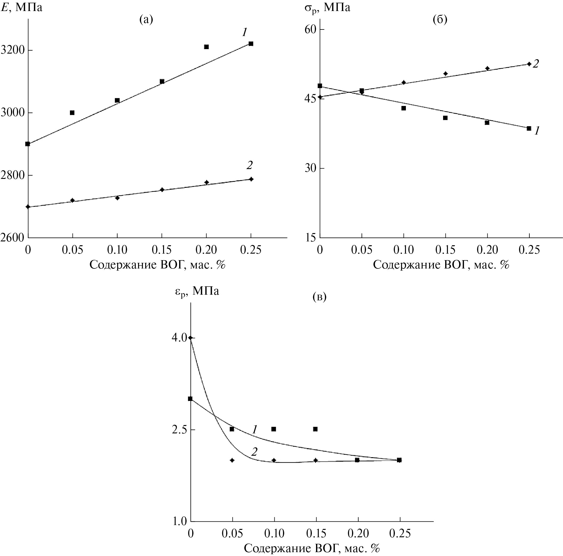 Рис. 2. Зависимость модуля упругости Е (а), предельной прочности sр (б) и удлинения при разрыве eр (в) от содержания ВОГ в композициях полилактид–ВОГ, полученных жидкофазным (1) и твердофазным (2) методами.