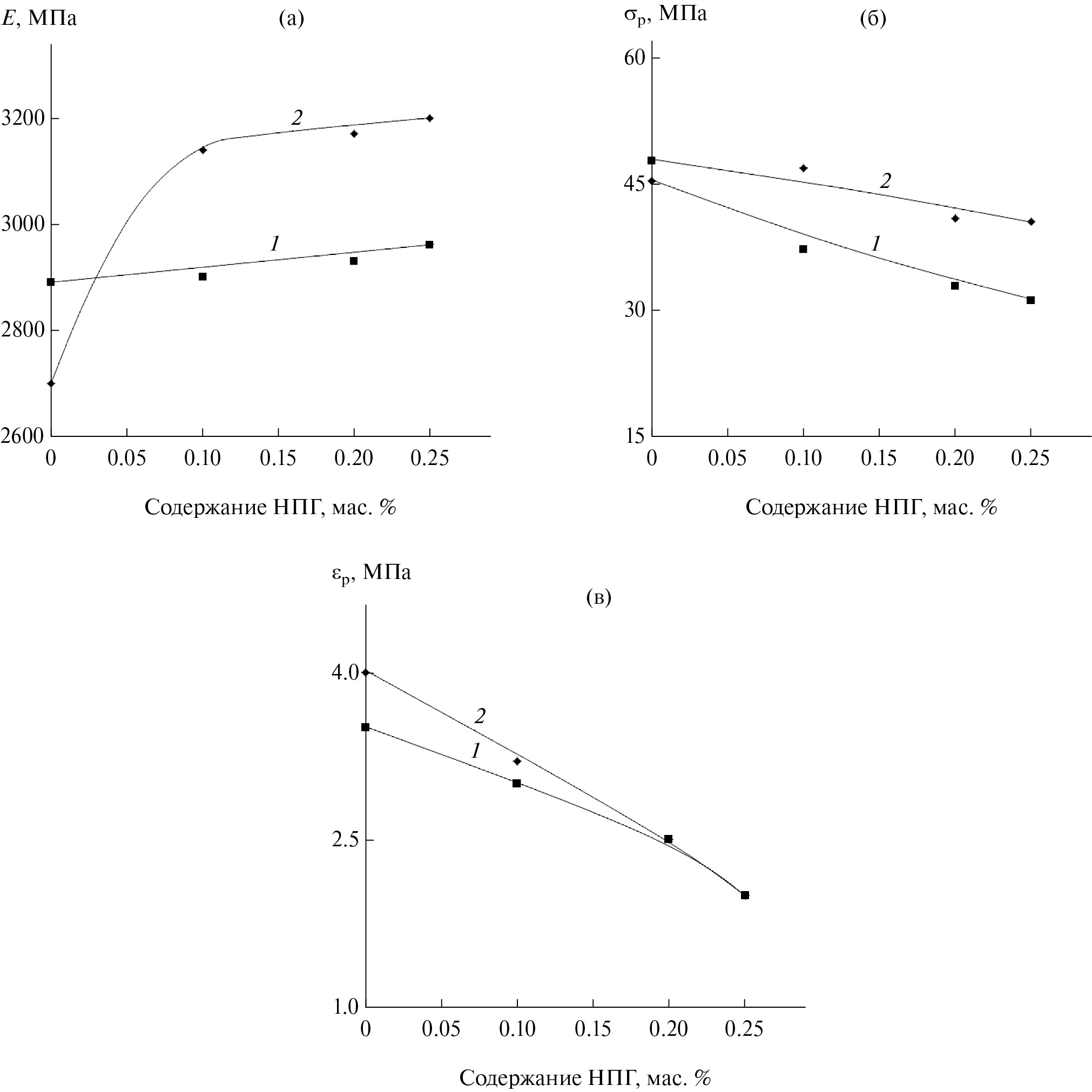 Рис. 3. Зависимость модуля упругости Е (а), предельной прочности sр (б) и удлинения при разрыве eр (в) от содержания НПГ в композициях полилактид–НПГ, полученных жидкофазным (1) и твердофазным (2) методами.