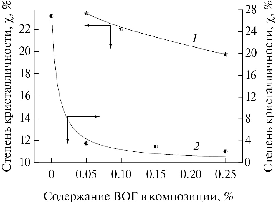 Рис. 5. Зависимость степени кристалличности c полилактида от содержания ВОГ в композициях, полученных в растворе хлороформа (1) и в условиях твердофазного смешения (2) [78].