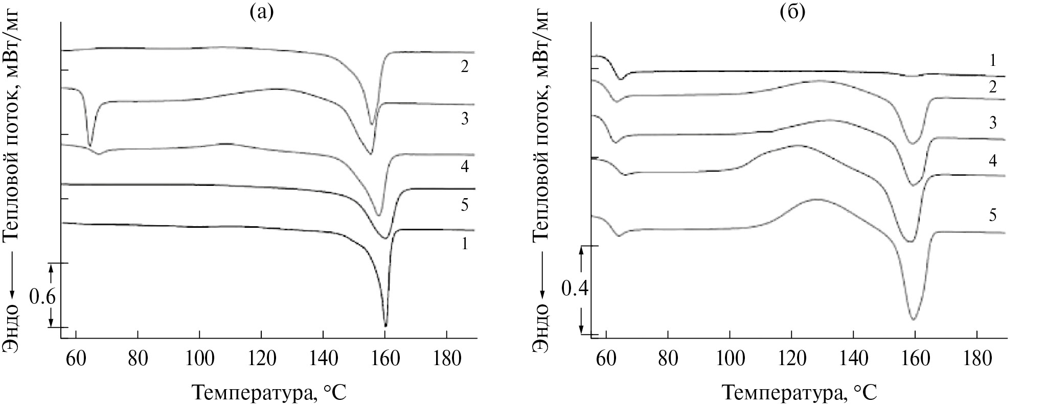 Рис. 6. ДСК-термограммы полилактида (1) и его композиций, содержащих 1.0 мас. % НПГ (2), ВОГ (3) и 5.0 мас. % НПГ(4), ВОГ (5) при первичном (а) и вторичном нагревании (б) [82].