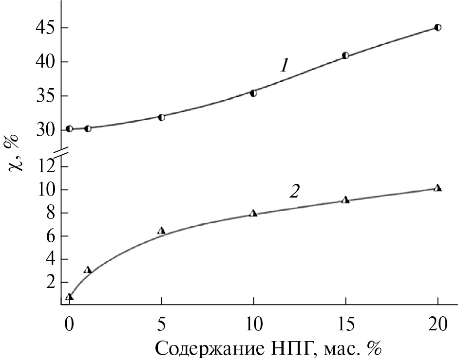 В то же время при жидкофазном синтезе возрастание концентрации НПГ также приводит к увеличению модуля упругости и уменьшению разрывной прочности и удлинения при разрыве, однако эти значения несколько ниже, чем у композиций аналогичного состава, полученных в твердой фазе (рис. 3).