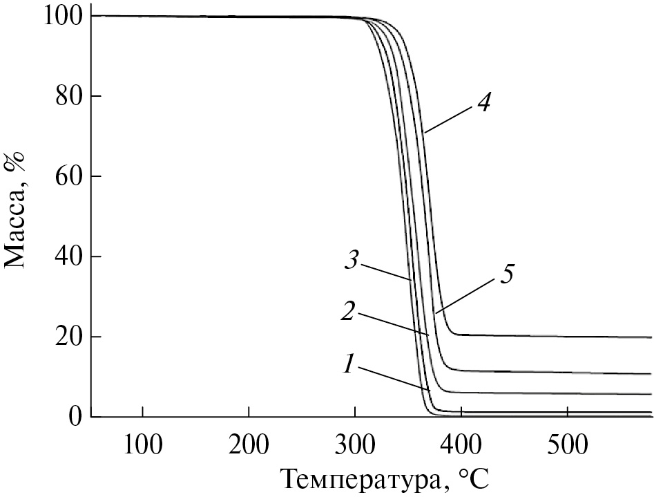 Рис. 8. Термограммы полилактида (1) и композиций полилактид–НПГ, содержащих 1.0 (2), 5.0 (3), 10.0 (4), 20.0 мас. % НПГ (5) [79].