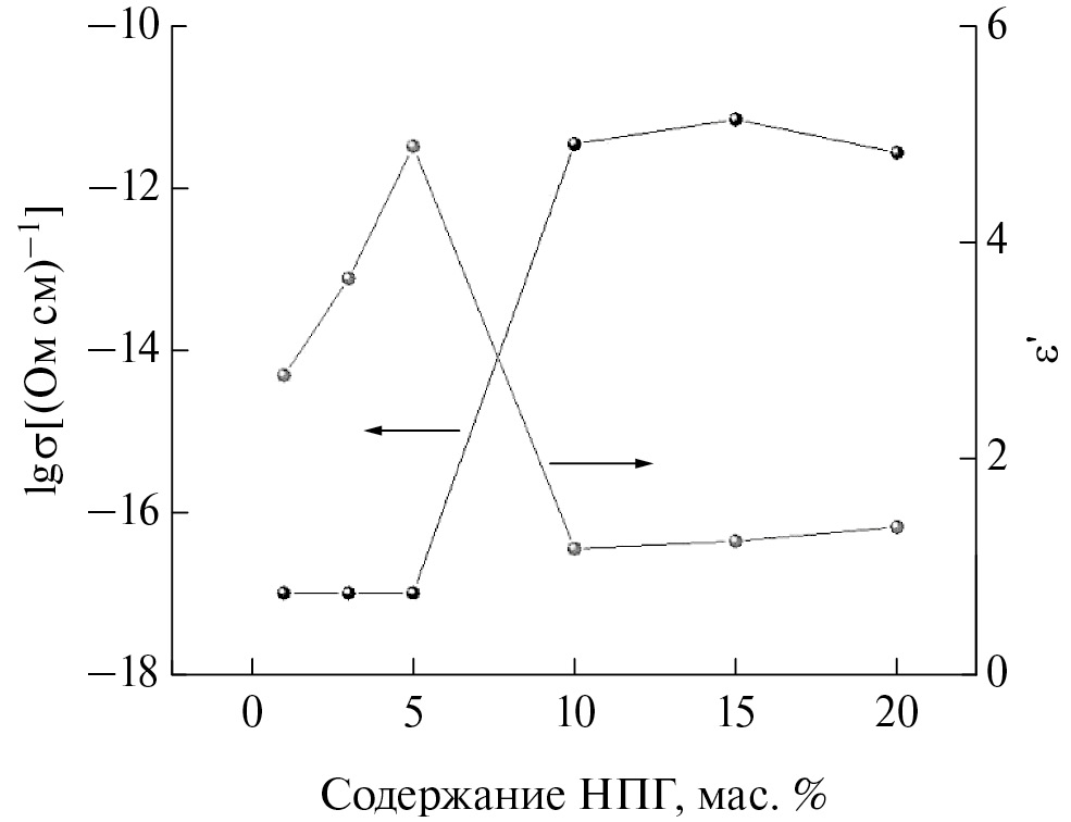 Было установлено, что при концентрации НПГ менее 10.0 мас. % наблюдается линейная зависимость проводимости от частоты, т.е. концентрация наполнителя ниже порога перколяции. Сквозная проводимость (независимость от частоты) появляется при концентрации наполнителя 10.0 мас. %, однако остается весьма низкой и составляет 3.5 × 10–12 (Ом см)–1. С дальнейшим увеличением концентрации наполнителя проводимость практически не меняется, хотя его содержание увеличивается в два раза.