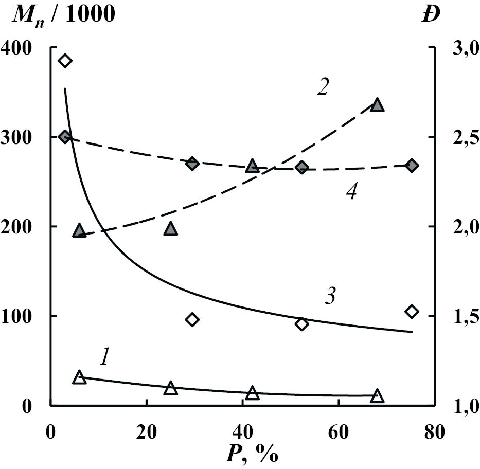Рис. 3. Зависимости Mn (1, 3) и Đ (2, 4) образцов ПММА от конверсии мономера. Облучение светом с λмакс ~ 365 нм; объемное соотношение ММА : ДМСО = 1 : 1; инициатор 1 мол. % CBr4 (1, 2) и t-BuBr (3, 4); дегазация: 1, 2 – есть, 3, 4 – нет