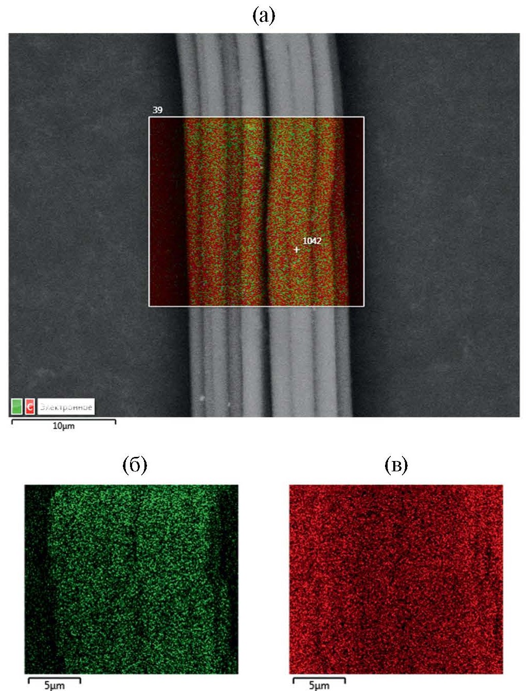 Результаты исследования состава и морфологии композиционного текстиля показывают, что его волокна представляют собой трехслойную структуру нитей смесевого текстиля, капсулированных слоем полипиррола с нанесенными поверх полипиррола частицами магнетита.