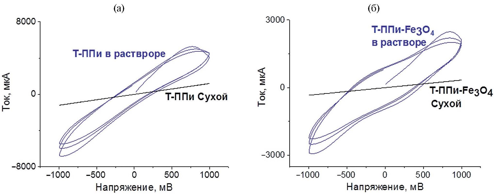 Электрохимические характеристики Т-ППи и Т-ППи-Fe3O4 изучали в двухэлектродной ячейке размером 35 × 9 мм, изготовленной из тефлона. Электроды из платиновой проволоки толщиной 1 мм и длиной 35 мм, накладывали на исследуемый кусок текстиля (35 × 9 мм), помещенный на дно ячейки и фиксировали его. Измерения проводили с использованием “Potentiostat/Galvanostat ELINS P-30J”, который позволяет регистрировать токи в диапазоне от 10 нА до 2 А и потенциалы в интервале 80 мкВ–15 В. Максимальная скорость регистрации 1580 точек/с.