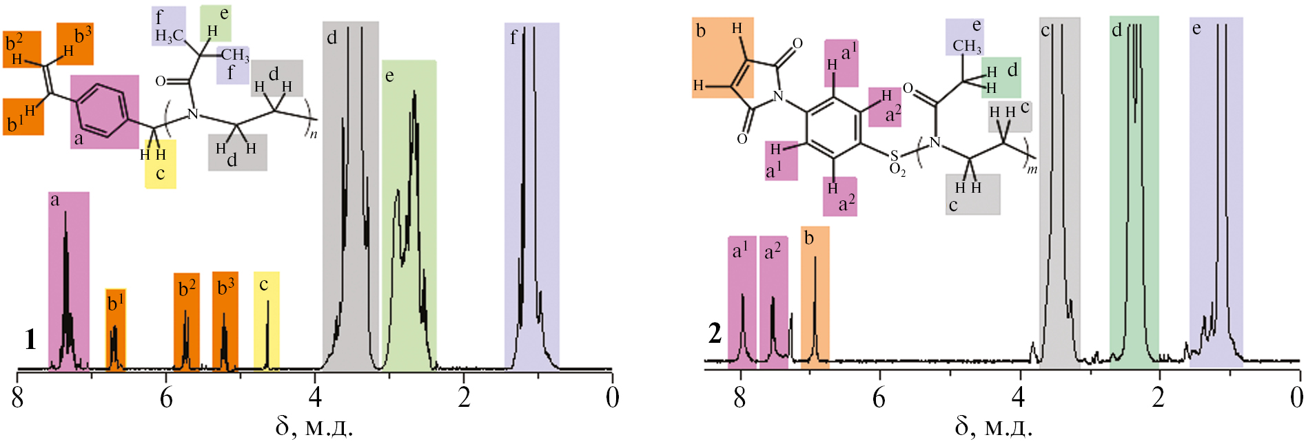 Мольные доли макромономеров f1 и f2 в полученном сополимере определяли на основе интегральных интенсивностей сигналов фрагментов малеимида (6.97 м.д.) и винилбензила (5.49 м.д.), а также сигналов гексаметилдисилоксана (0.14 м.д.) в качестве внутреннего стандарта в спектрах ЯМР 1H исходных и конечных образцов реакционных смесей.