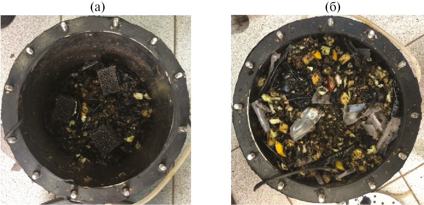 Рис. 1. Образцы ППК в пористых губках (а) и в составе компостной смеси из пищевых отходов (б) в эксперименте по исследованию биодеградации в реакционных емкостях. Цветные рисунки можно посмотреть в электронной версии