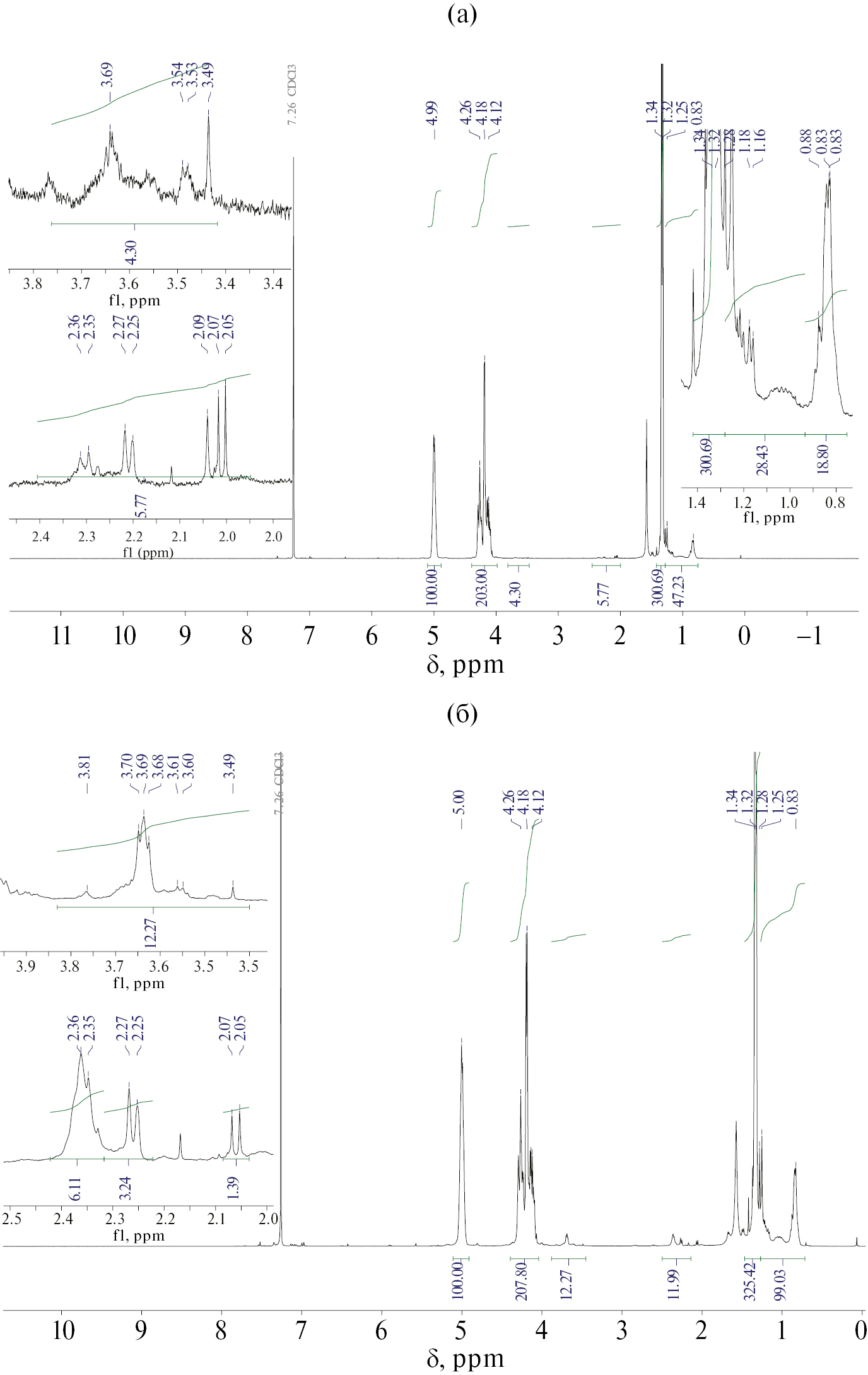 Рис. 5. Спектры ЯМР 1Н полипропиленкарбоната в CDCl3 после компостирования в течение 7 (а) и 28 дней (б)