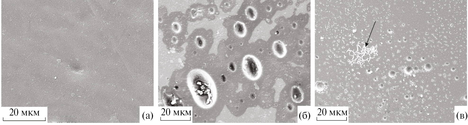 Рис. 7. СЭМ микрофотографии поверхностей образцов ППК до (а) и после компостирования в течение 7 (б) и 28 суток (в). Стрелкой отмечено скопление микроорганизмов