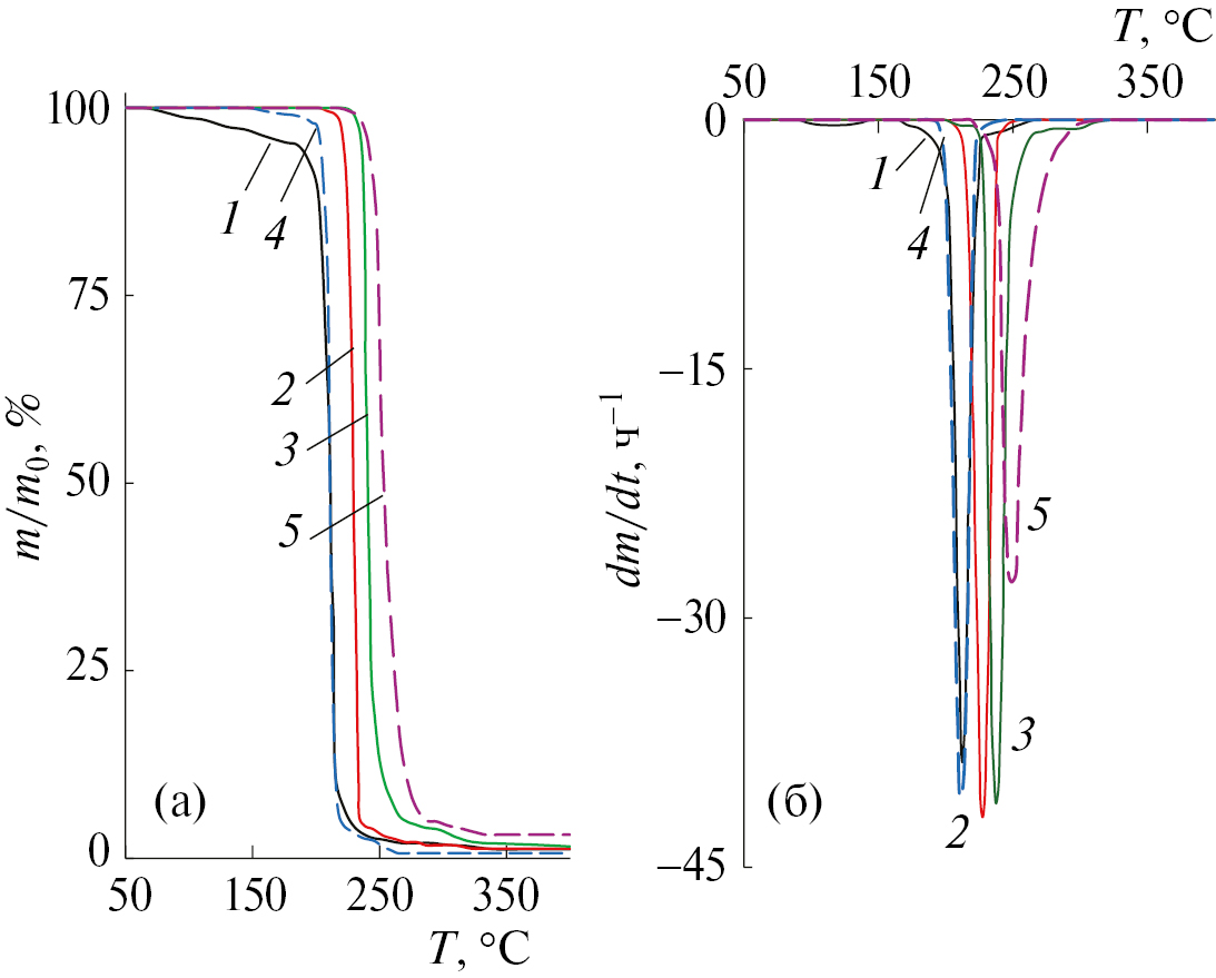 Рис. 8. Интегральные (а) и дифференциальные (б) кривые ТГА образцов ППК до (1) и после компостирования в течение 7 (2) и 28 суток (3), а также после выдерживания ППК в течение 7 дней в воде при 65 °С (4) или над 10%-ным раствором аммиака при комнатной температуре (5)