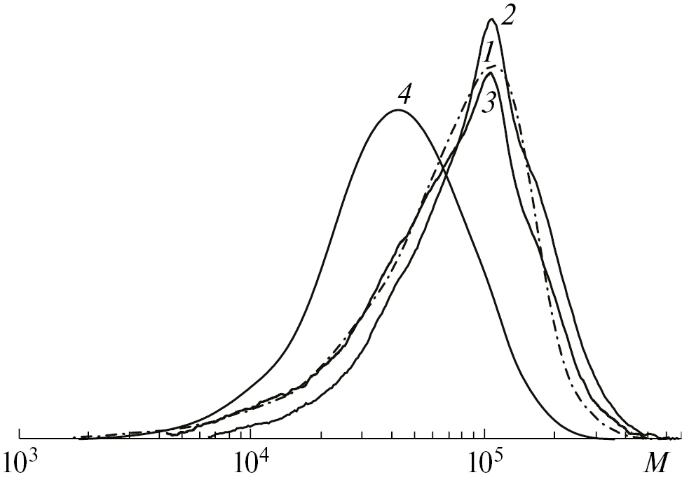Рис. 9. Кривые ММР пленки ППК до (1) и после обработки водой при 65 °С (2) и аммиаком в течение 7 дней при 25 °С (3) и 12 ч при 100 °С (4)