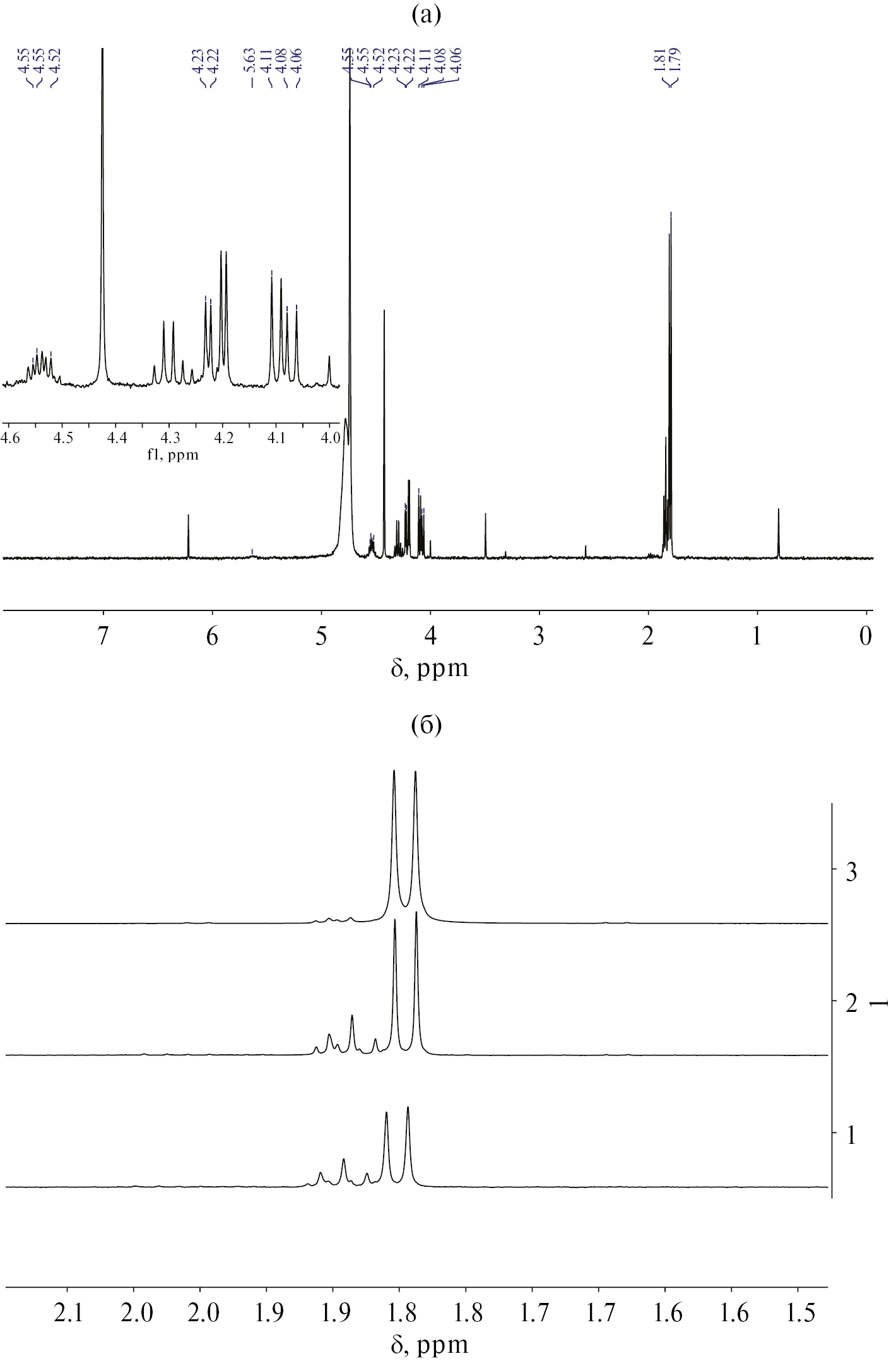 Рис. 11. Спектр ЯМР 1H раствора в условиях эксперимента с подавлением сигнала H2O: а ‒ нагревание при 70 °С в течение 5 ч; б ‒ сравнение сигналов в области 1.5–2.2 м.д. после нагревания при 70 °С в течение 5 (1), 20 ч (2), и дополнительного нагревания при 100 °С в течение 12 ч (3)