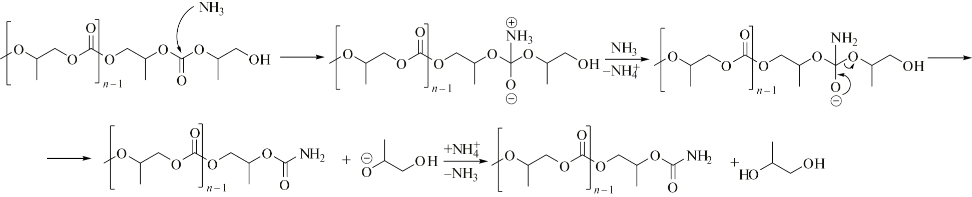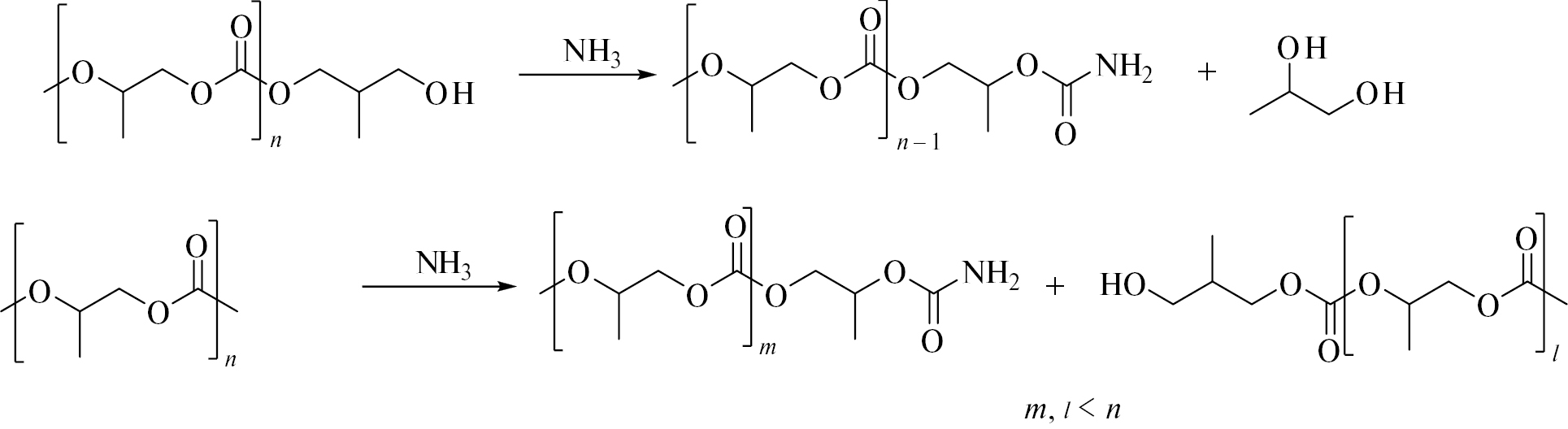 Аммонолизу может подвергаться как концевая карбонатная группа, так и карбонатная группа, расположенная внутри цепи. Во втором случае образуются два полипропиленкарбонатных фрагмента с молярной массой меньшей, чем у исходного полимера: