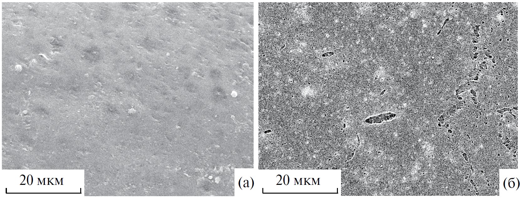 Рис. 10. СЭМ микрофотографии поверхности образца ППК после выдерживания в течение 7 дней в воде при 65 °С (а) или над 10%-ным раствором аммиака при комнатной температуре (б).