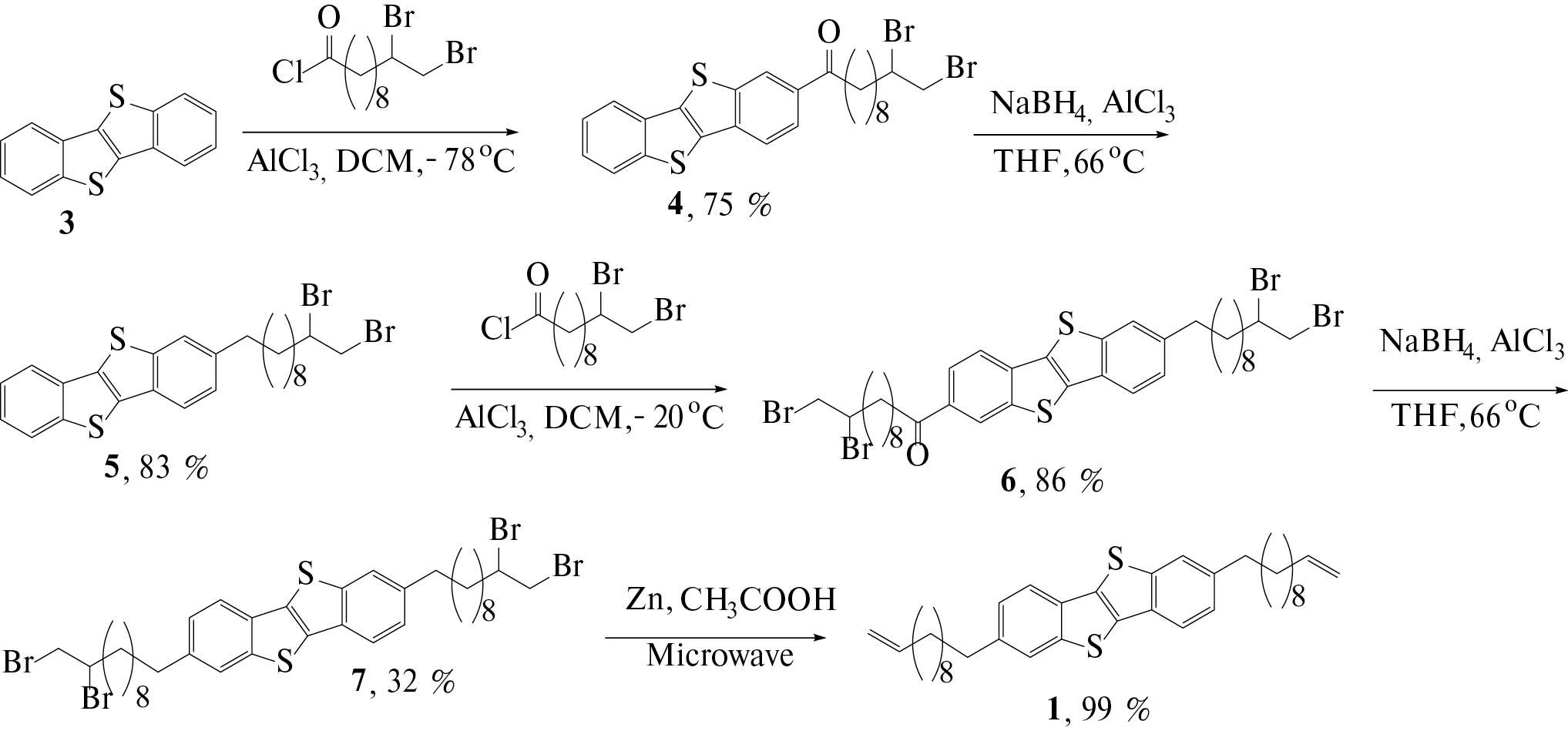 Синтез мономеров 1 и 2 осуществлялся на основе адаптированных методик, опробованных ранее при синтезе дисилоксановых димеров различных диалкил-BTBT [18, 23] и 2,7-диоктил-BTBT [24]. Для синтеза реакционного мономера 1 на первом этапе была проведена постадийная реакция введения 10,11-дибромундеканоилхлорида в ядро BTBT по методу Фриделя‒Крафтса с последующим восстановлением кето-группы в присутствии смеси боргидрида натрия NaBH4 с хлоридом алюминия AlCl3. Как было показано ранее [18], реакция Фриделя‒Крафтса с ундецен-10-ил хлоридом, содержащим концевую двойную связь, не проходит, поэтому она предварительно была защищена бромированием. Кроме этого, реакция ацилирования монозамещенного продукта 4 не проходит, поэтому требуется его предварительное восстановление с образованием соединения 5, с которым затем был проведен повторный цикл ацилирования и восстановления с образованием соединений 6 и 7 соответственно. Завершающий этап включал реакцию снятия бромной защиты дизамещенного соединения 7 в присутствии порошкового цинка и ледяной уксусной кислоты в микроволновой системе органического синтеза с образованием двух терминальных двойных связей мономера 1 (схема 2).