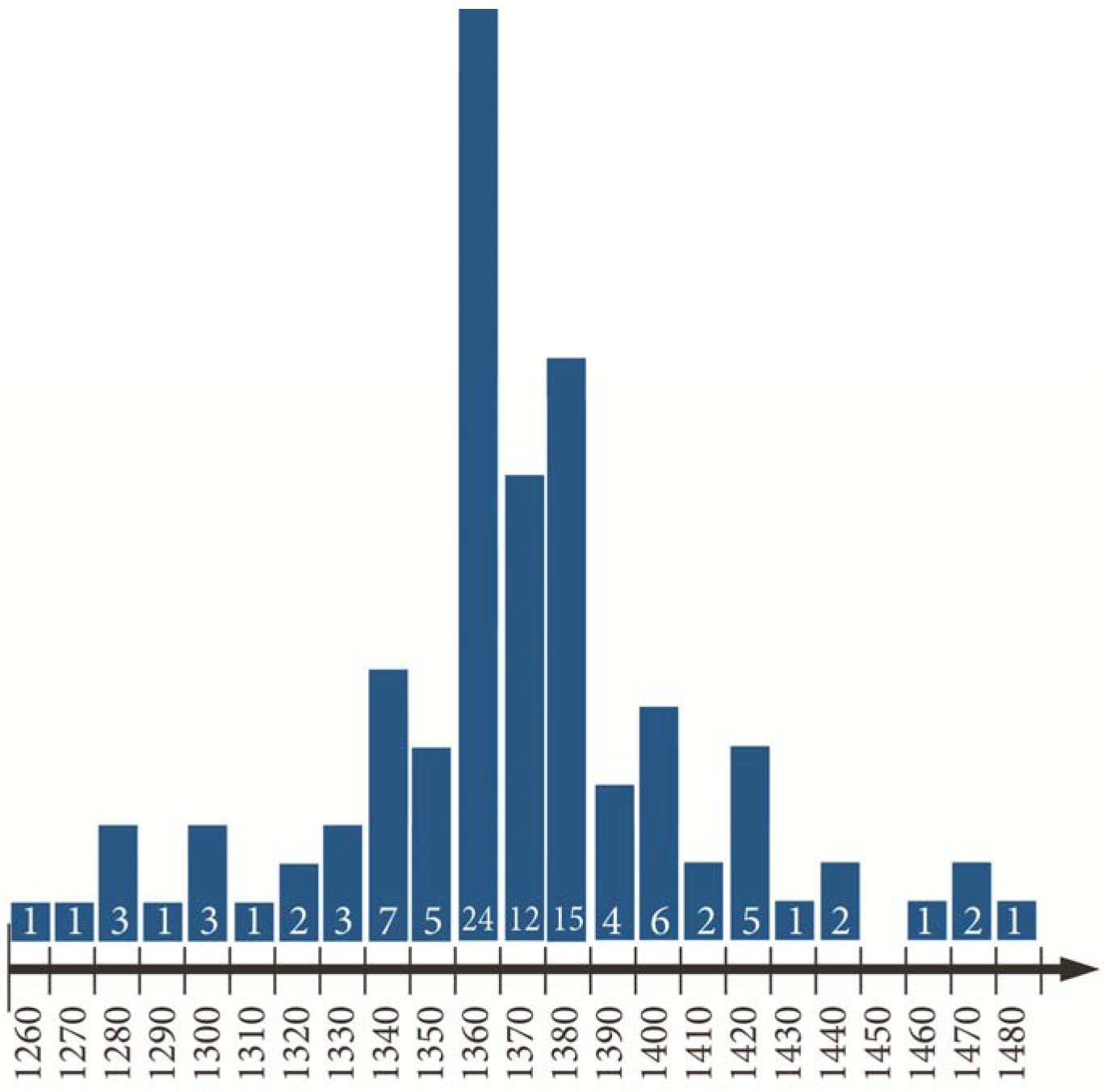 В результате сопоставления датированного материала, удалось установить, что основная масса памятников закономерно относится ко времени наибольшего расцвета средневекового города Солхат/Кырым – к 40-м – 80-м годам XIV века. Но самый значительный пик неожиданно приходится на годы смуты – 60-80-е годы XIV века (Рис. 1). На эти годы приходится почти половина всех датированных памятников10.