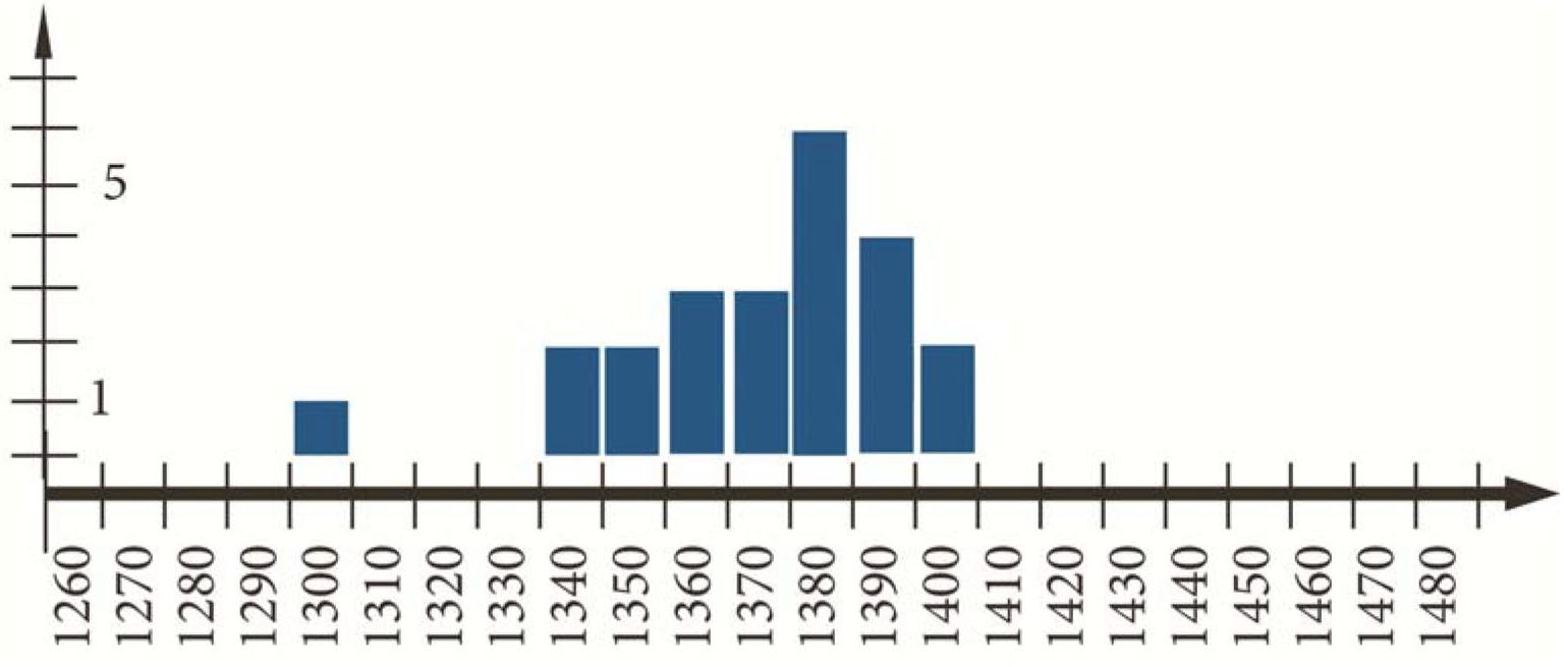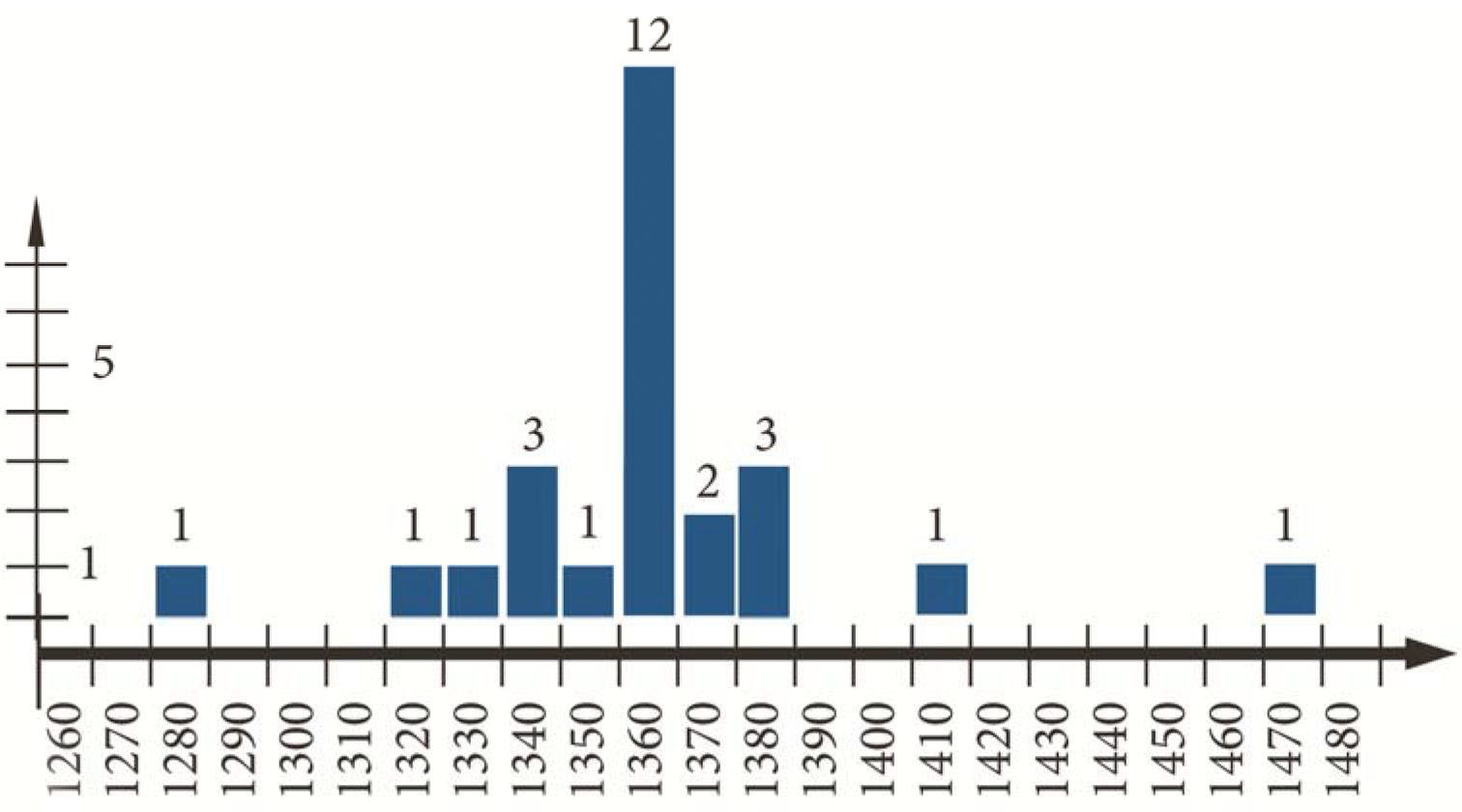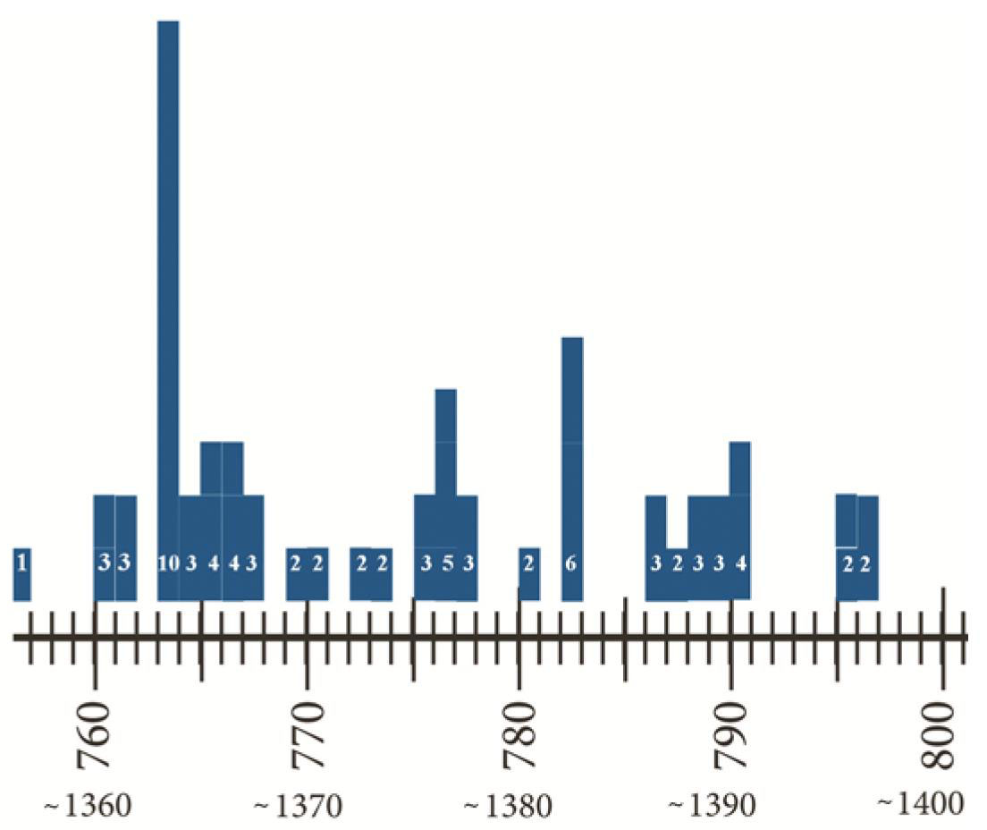 Распределение памятников в период с 1360-х по 1380-е гг. Рассматривая более подробно пик количества памятников который приходится на период 60–80 годов XIV века, сразу бросается в глаза большое количество памятников с датой 763 г.х. (= 1361/62 год) (Рис. 2). При общем рассматриваемом периоде времени в более чем двести лет, только на один этот год приходится десять(!) процентов всех датированных памятников Солхата. Из десяти11 надмогильных памятников с датой 763 г.х., три приходится на один месяц – Зу-ль-Хиджа. Конечно же, есть небольшая вероятность случайного совпадения такого количества памятников с одной датой, или можно связать это с лучшей сохранностью кладбища именно этого периода времени. Но памятники были найдены в разное время, в течение более чем ста лет, и в разных частях города, и свести это к простой случайности все же сложно.