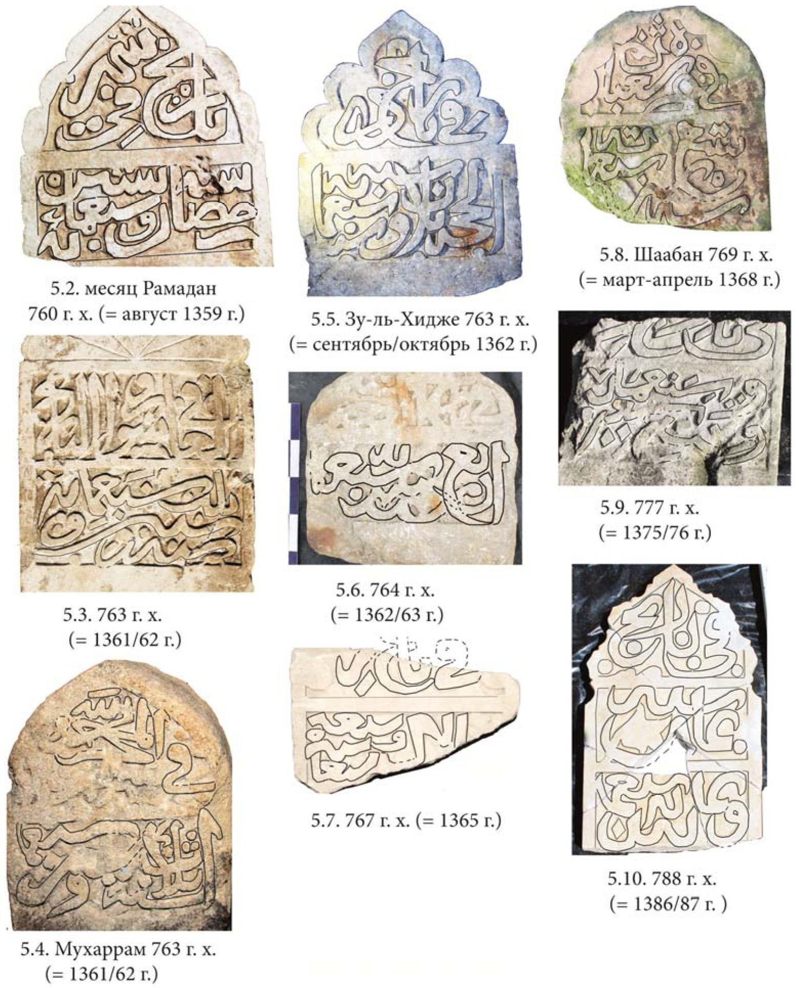 Одна надпись, упомянутая у Эвлия Челеби, приведена в русском переводе у Бахревского Е.В. в виде зашифрованной даты в словосочетании «Высшее вращение Луны» – 763 г. х. [21, с. 168]. Так как в разных списках работы Эвлия Челеби приводится как минимум два разных варианта этой фразы «alâü'd-devri'l-kameriyye» [22, с. 664], которые дают в результате разные цифровые значения года5, этот памятник не учтен в данной работе. Среди датированного материала большое количество памятников с утратами. Это результат воздействия атмосферных осадков, выветривания, повреждения экскаватором при извлечении из земли и т.п.
