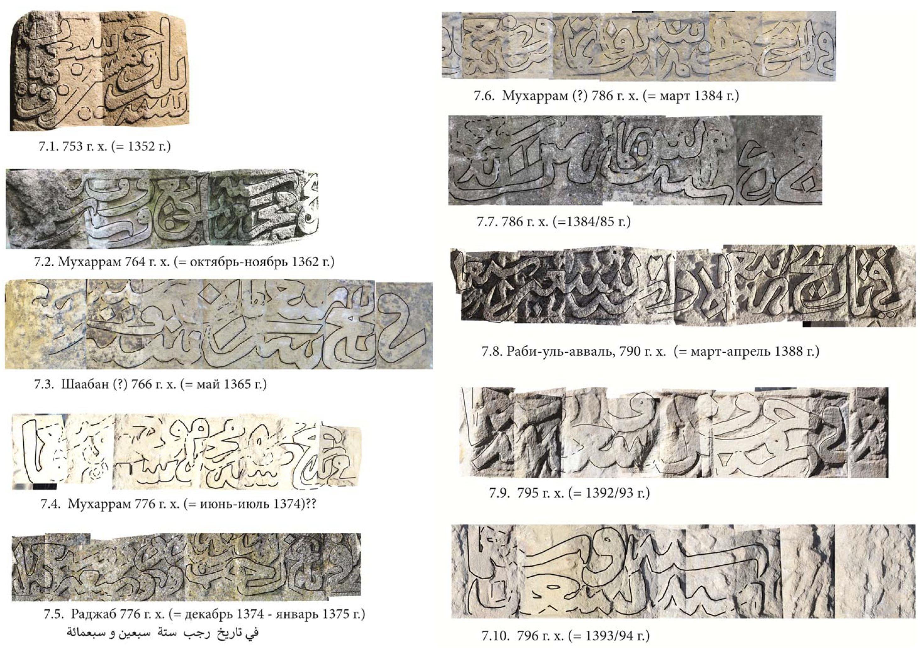 7.1. 753 г.х.(= 1352 г.); 7.2. Мухаррам 764 г.х. (= октябрь-ноябрь 1362 г.); 7.3. Шаабан (?) 766 г.х. (= май 1365 г.); 7.4. Мухаррам 776 г.х. (= июнь-июль 1374)??; 7.5. Раджаб 776 г.х. (= декабрь 1374 – январь 1375 г.); 7.6. Мухаррам (?) 786 г.х. (= март 1384 г.); 7.7. 786 г.х. (=1384/85 г.); 7.8. Раби-уль-авваль, 790 г.х. (= март-апрель 1388 г.); 7.9. 795 г.х. (= 1392/93 г.); 7.10. 796 г.х. (= 1393/94 г.)