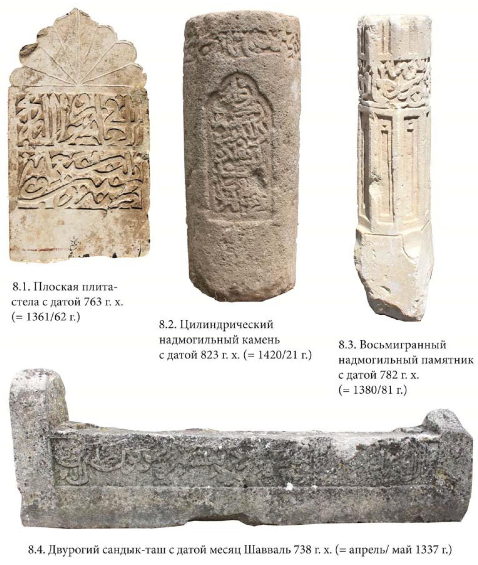 8.1. Плоская плита-стела с датой 763 г.х. (= 1361/62 г.); 8.2. Цилиндрический надмогильный камень с датой 823 г.х. (= 1420/21 г.); 8.3. Восьмигранный надмогильный памятник с датой 782 г.х. (= 1380/81 г.); 8.4. Двурогий сандык-таш с датой месяц Шавваль 738 г.х. (= апрель/ май 1337 г.)