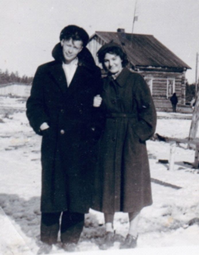 Рис. 2. Супруги Тепляковы на фоне дома в посёлке геологов, 1959 г. Из архива Теплякова Е.А.