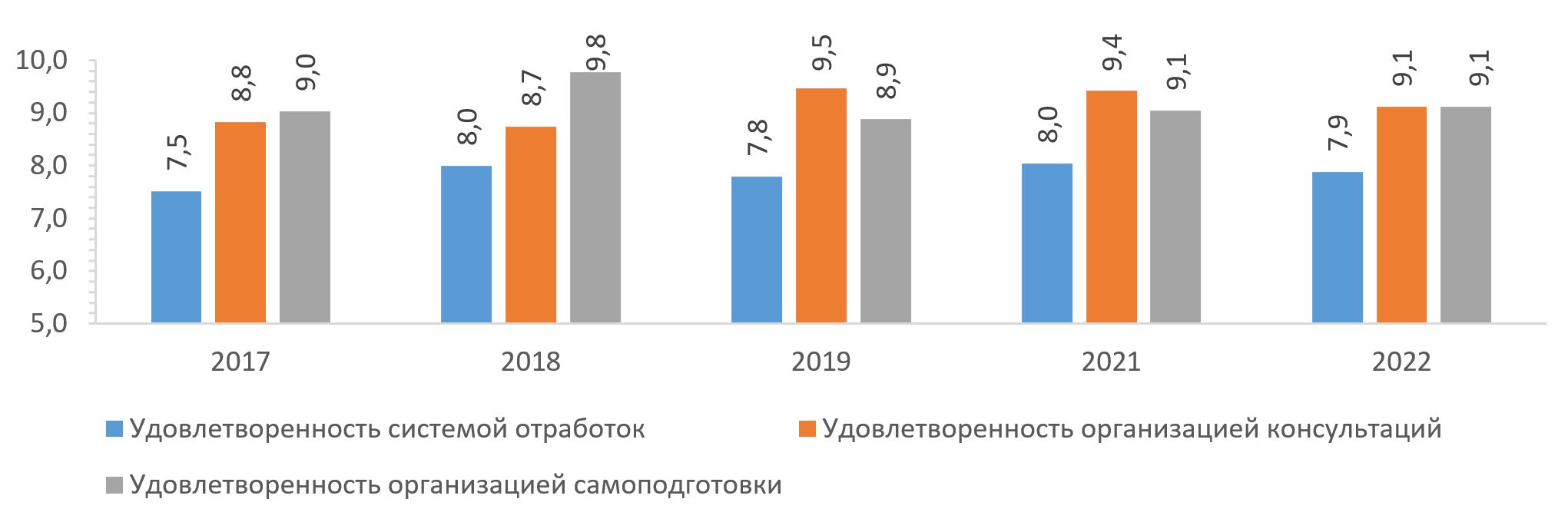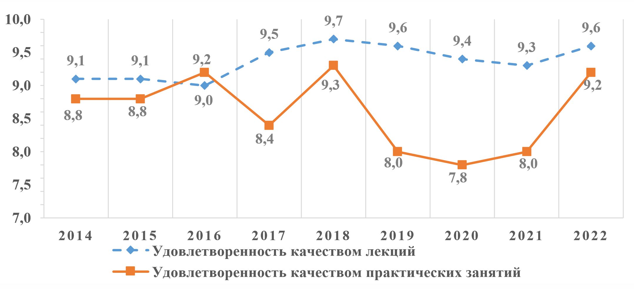 Качество лекционных занятий студенты оценивали несколько выше, чем качество практических. Более низкие значения средних баллов удовлетворенности практическими занятиями, установленные в 2017 (8,4±0,23) и период с 2019 по 2021 годы (8,0±0,98; 7,8±1,2; 8,0±0,86 соответственно), были обусловлены тем, что от 10 до 12% респондентов в эти годы посчитали их качество низким. Возможно, это могло быть связано с завершением переходных периодов на новые ФГОС в 2017 и 2021 годах, а также дистанционным преподаванием практических занятий в период с 2019 по 2021 годы.