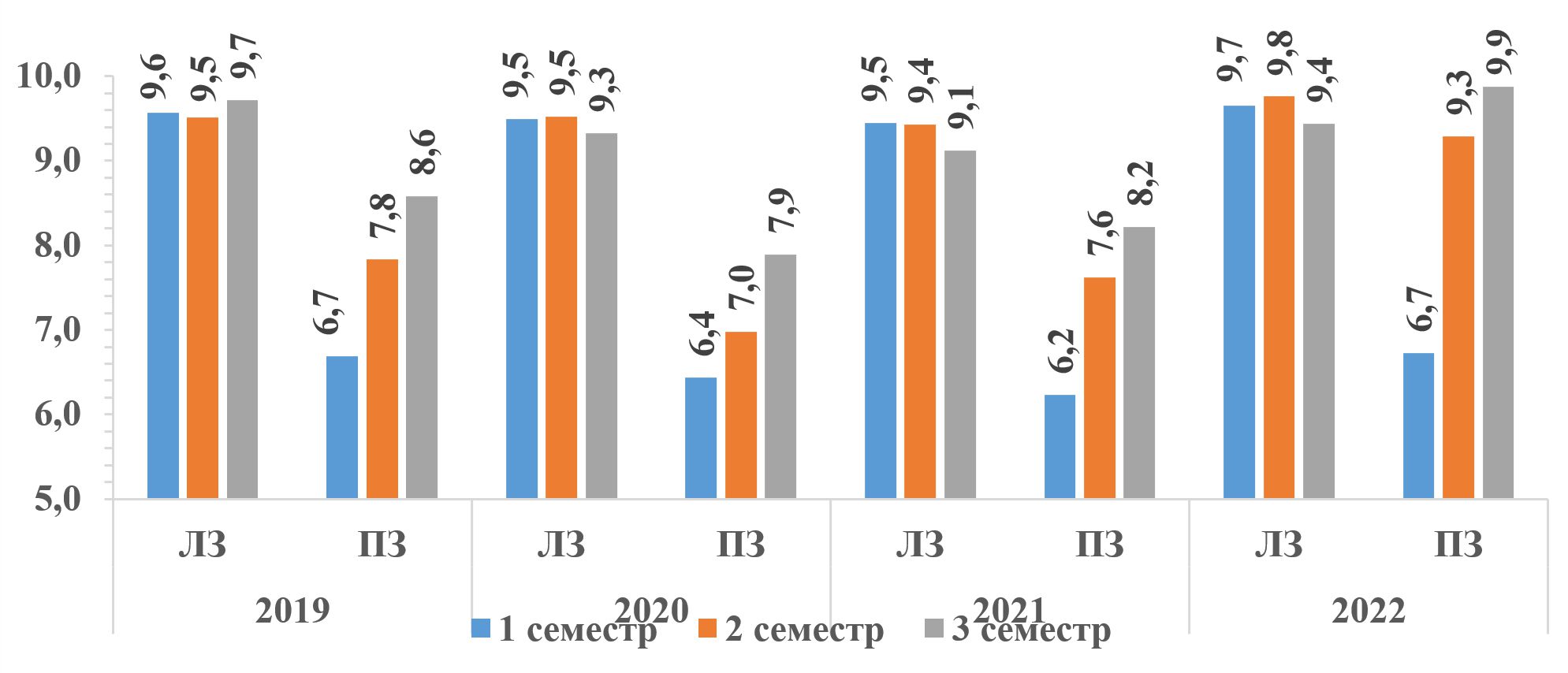 Посеместровая оценка качества практических и лекционных занятий по дисциплине, введенная в 2019 году, установила, что средний балл удовлетворенности лекциями соответствовал ее высокому уровню и держался в диапазоне от 9,12±1,2 до 9,76±1,4 независимо от полугодия (рис. 2).